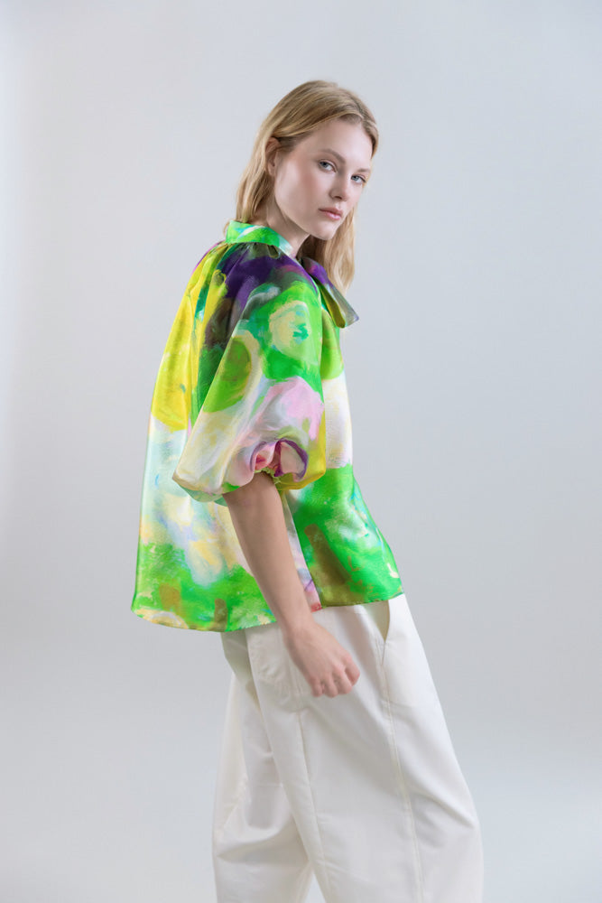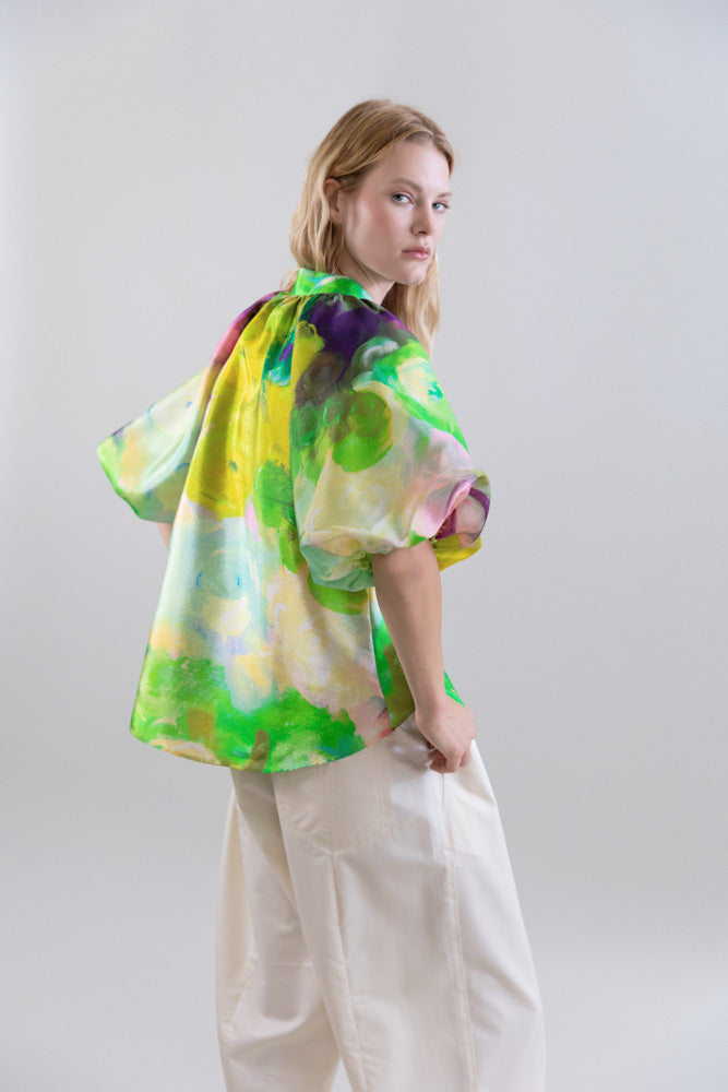 Confeccionada con poliéster reciclado , la blusa destaca por su tejido ligero y su acabado brillante. El exclusivo estampado Bloomlight, con una mezcla de verdes, amarillos y toques artísticos, aporta frescura y luminosidad, haciendo que esta pieza sea versátil para looks tanto casuales como más formales.