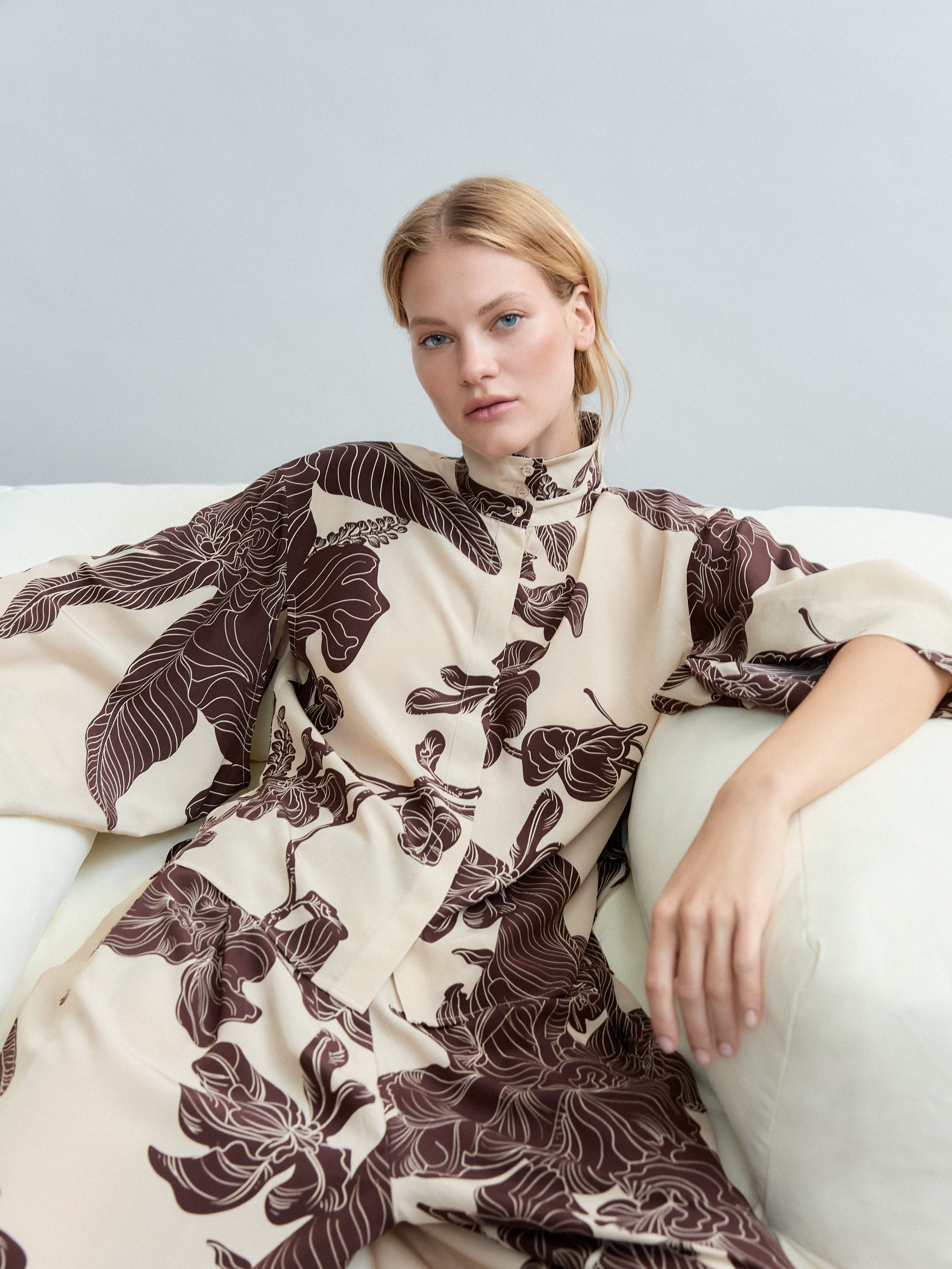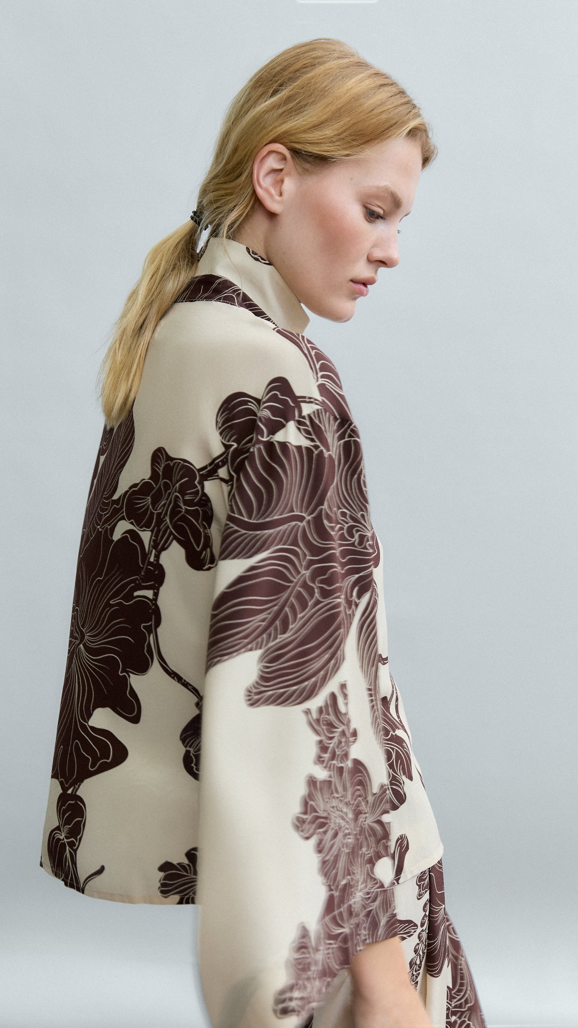 Blusa de seda CDC con estampado Orient Contour, donde hojas y elementos florales estilizados parecen fluir sobre la tela, aportando ligereza y movimiento. El cuello doble mao enmarca el rostro con discreta sofisticación, mientras que las mangas kimono amplias crean una silueta envolvente y confortable.
