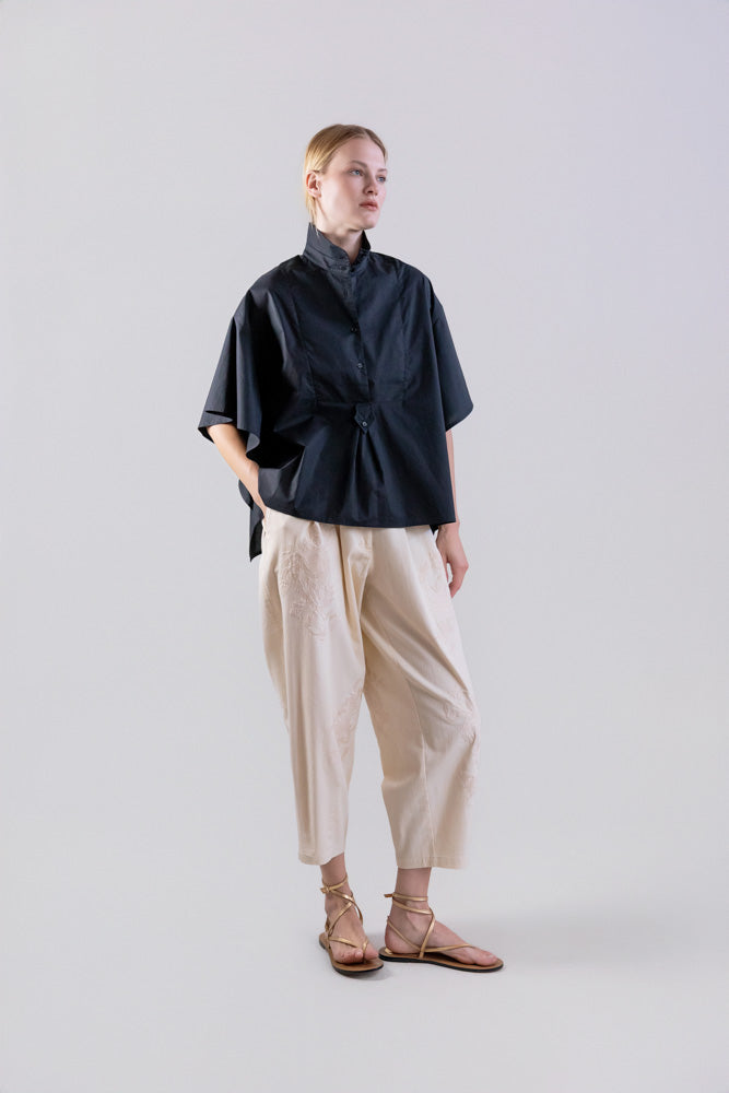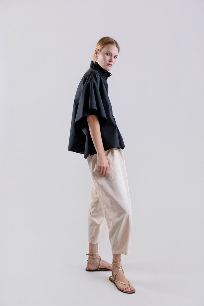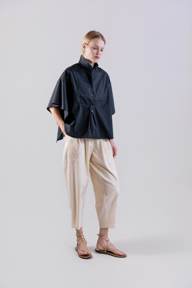 El tejido bordado añade un detalle táctil y visual que eleva la pieza, armonizando con la camisa a juego y creando un conjunto coordinado y sofisticado. Diseñados para estilismos modernos que buscan comodidad, elegancia discreta y un toque artesanal, estos pantalones son una pieza versátil .
