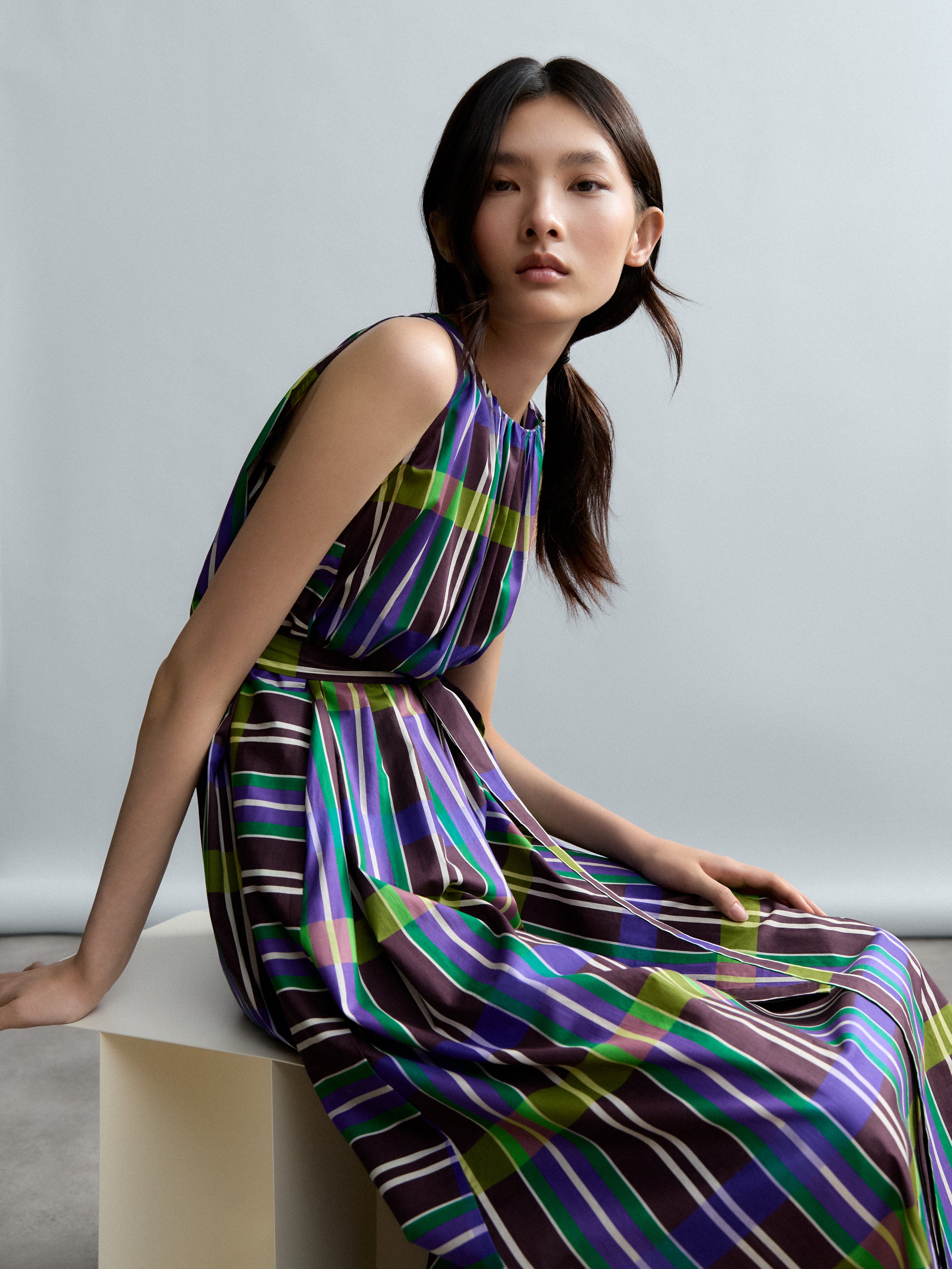 El print Retro Prism combina líneas verticales y horizontales en una cuadrícula vibrante, donde tonos morado, verde, marrón y amarillo crean un juego dinámico de color y contraste. El resultado es un estampado lleno de energía y complejidad visual, reinterpretado en una clave contemporánea.