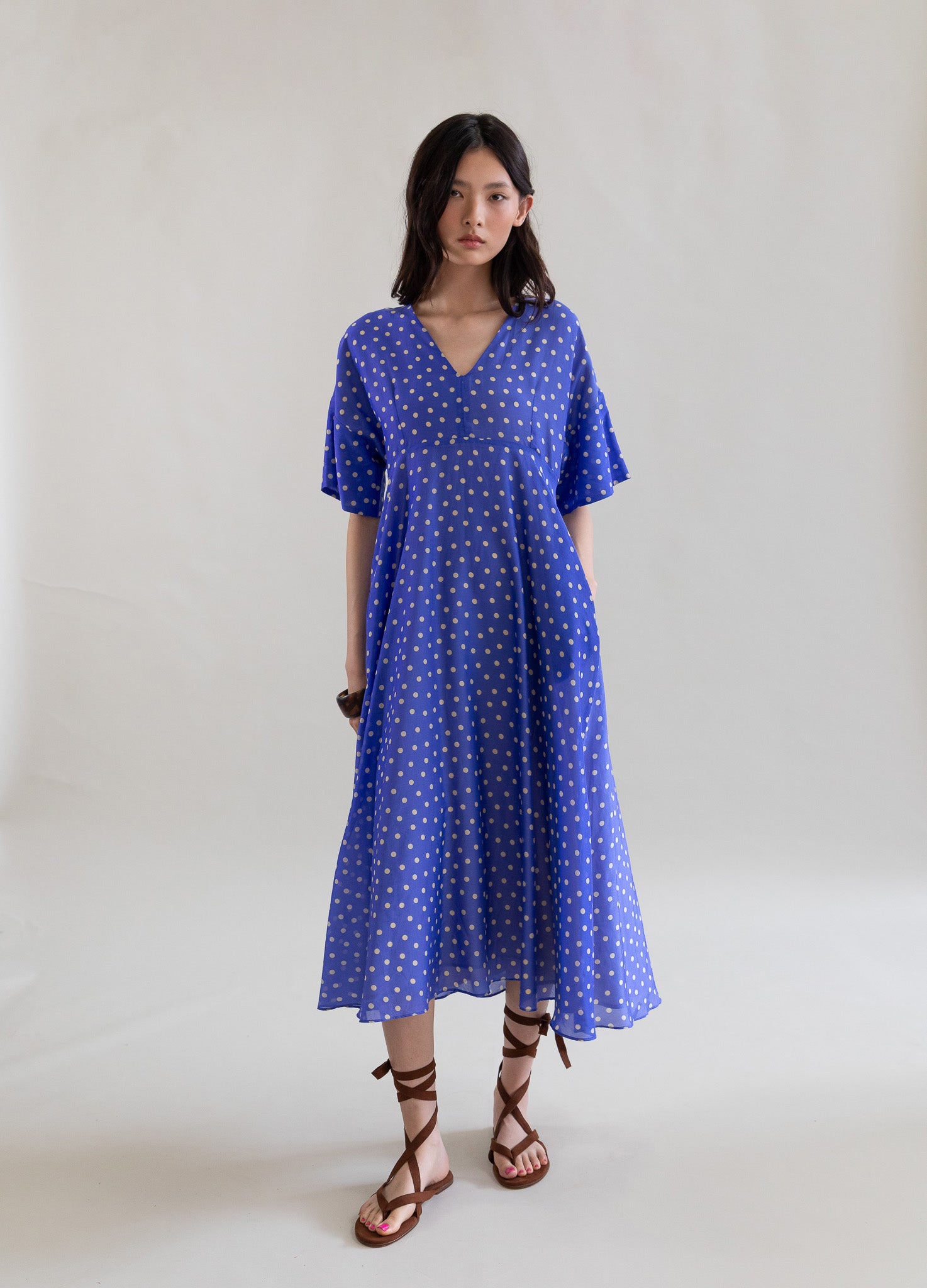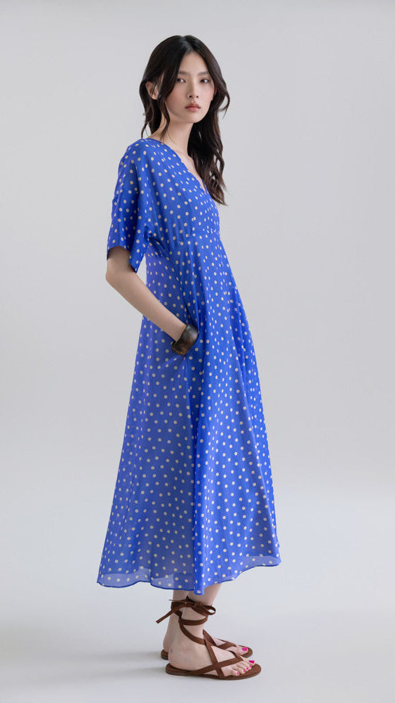 El corte empire justo debajo del pecho acentúa la figura mientras mantiene una caída fluida hasta la mitad de la pantorrilla, creando movimiento y ligereza en cada paso. Confeccionado con tejido ligero y decorado con micro lunares, este vestido aporta un aire moderno, femenino y atemporal.