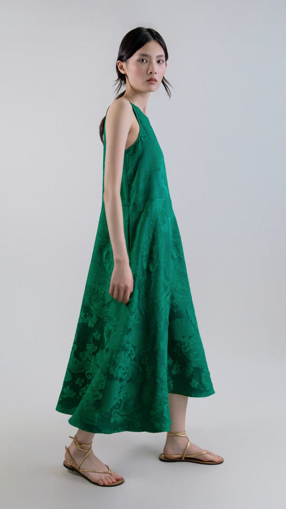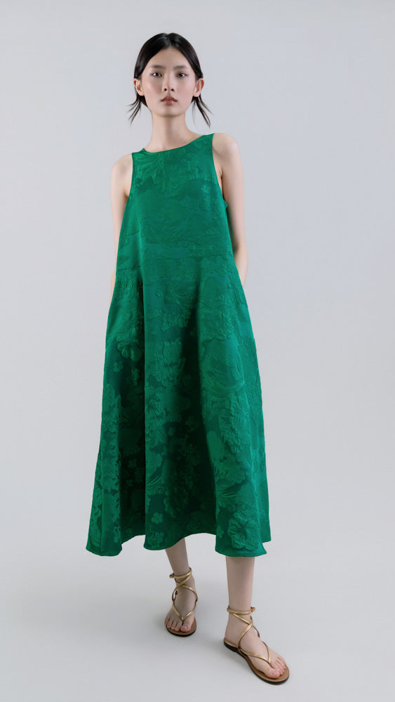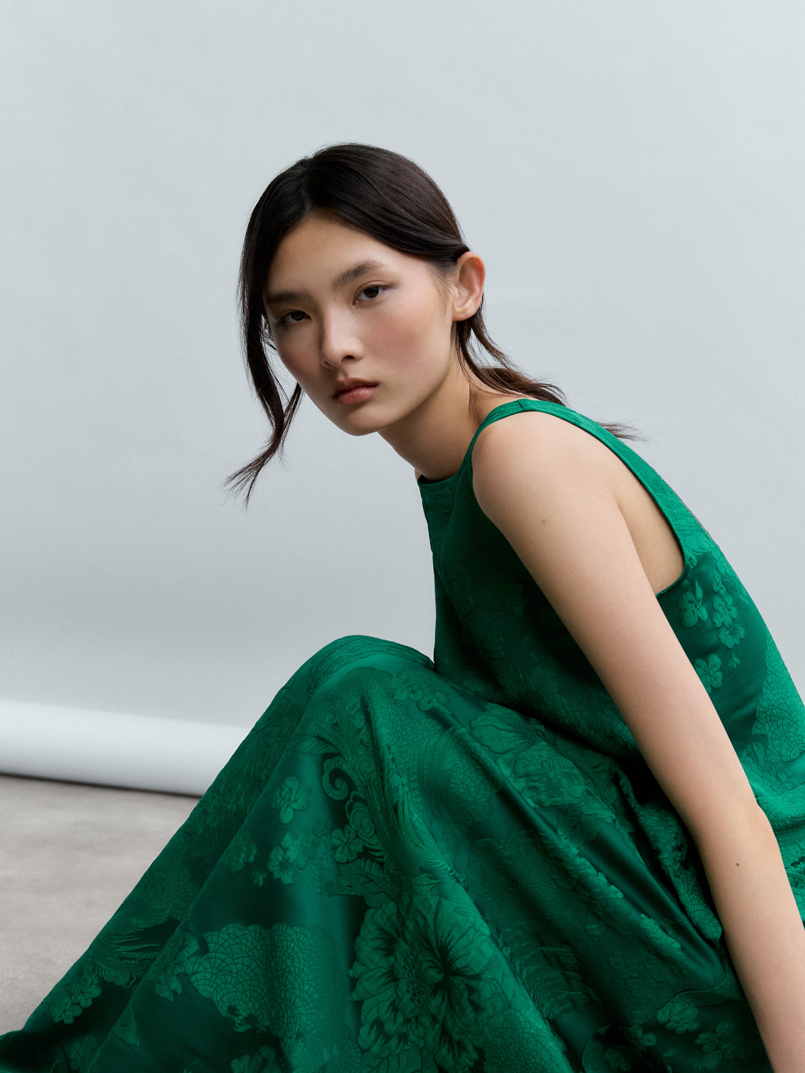 Este vestido midi en jacquard ligero verde, estilo baby doll, combina un diseño ligero y femenino con textura sutil y detalles refinados. El cuello redondo y la silueta sin mangas aportan limpieza al torso, mientras que la caída fluida y la forma suelta crean movimiento natural y comodidad.El tejido bordado añade textura y un detalle artesanal que aporta interés visual sin sobrecargar la prenda. Diseñado para looks modernos y frescos, este vestido ofrece comodidad, estilo y un aire juvenil, perfecto para el día a día o ocasiones informales con un toque diferente.