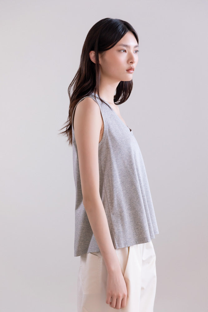 This sleeveless top features a clean, contemporary design with an A-line silhouette that gently flares from the chest to the hem, creating a fluid and lightweight drape. The straight cut from the shoulders creates a relaxed and flattering shape, ideal for comfortable and versatile wear.