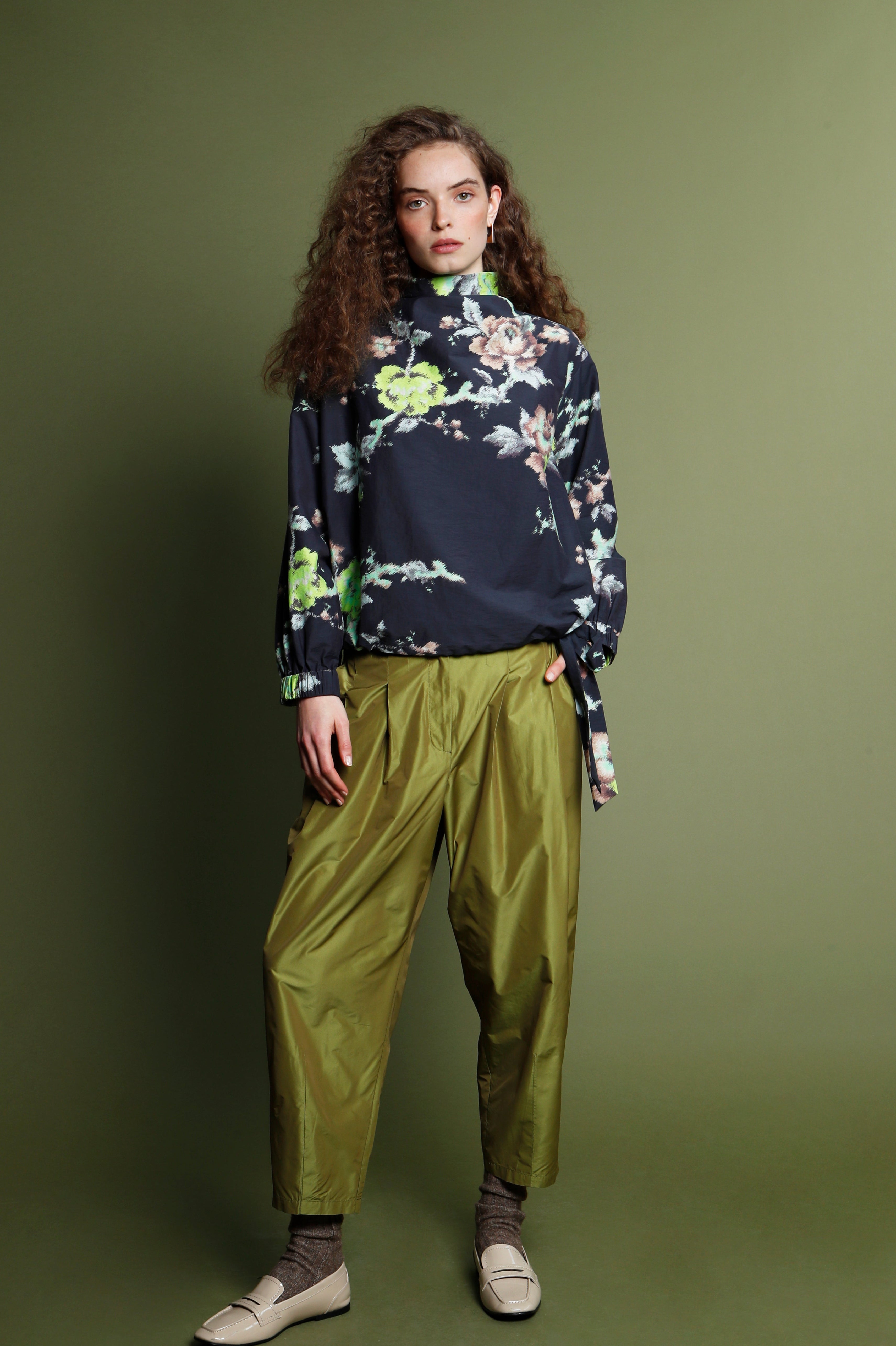 The Indian-inspired floral print runs across the fabric with a rich yet balanced aesthetic, while the bishop sleeves add elegant volume from shoulder to cuff, creating a fluid and expressive drape. The design is completed with functional side ties that allow for flexible adjustment of the silhouette, whether with a casual knot or a structured bow, adapting the blouse to the body or letting it flow freely.