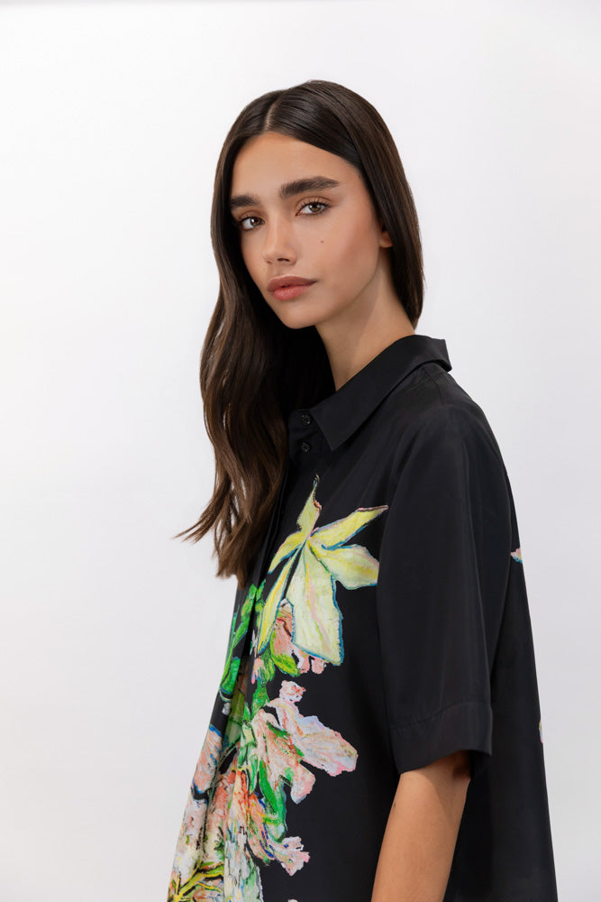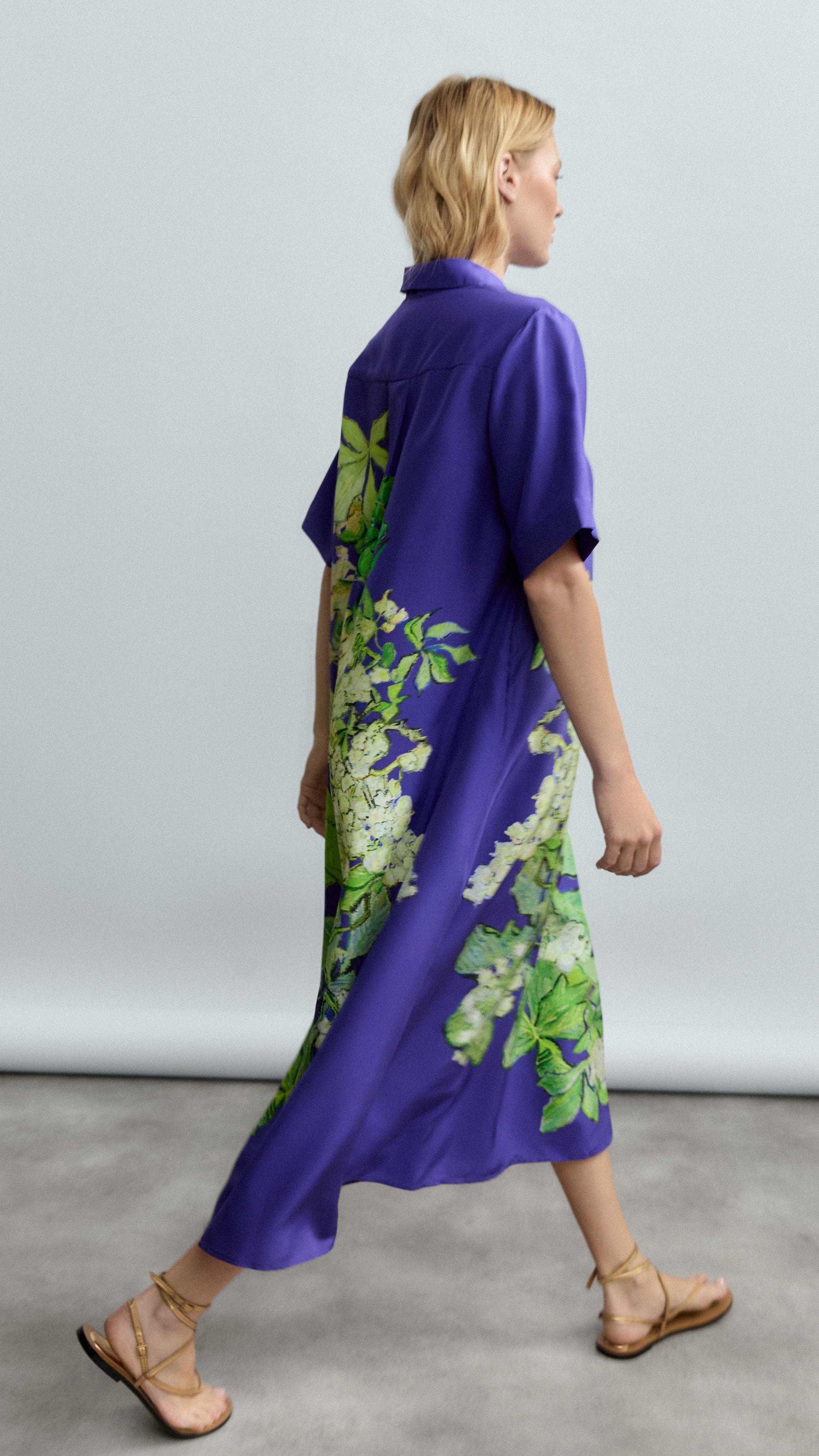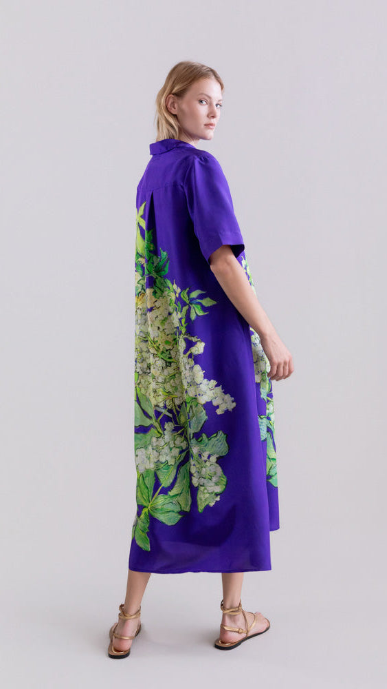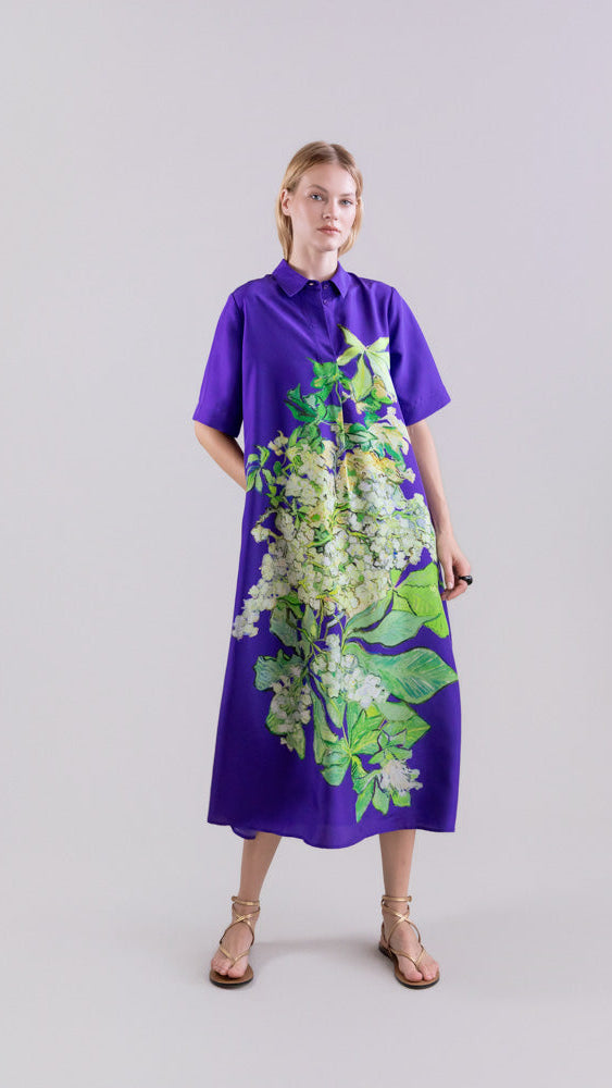 Hydrangea Brush Long Silk Shirt-Inspired Dress