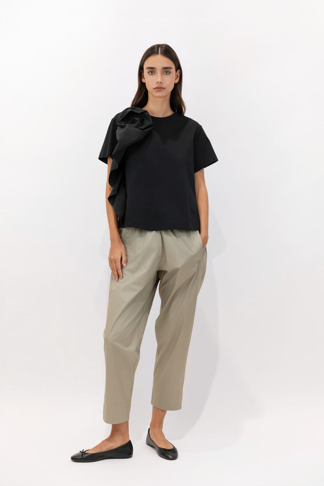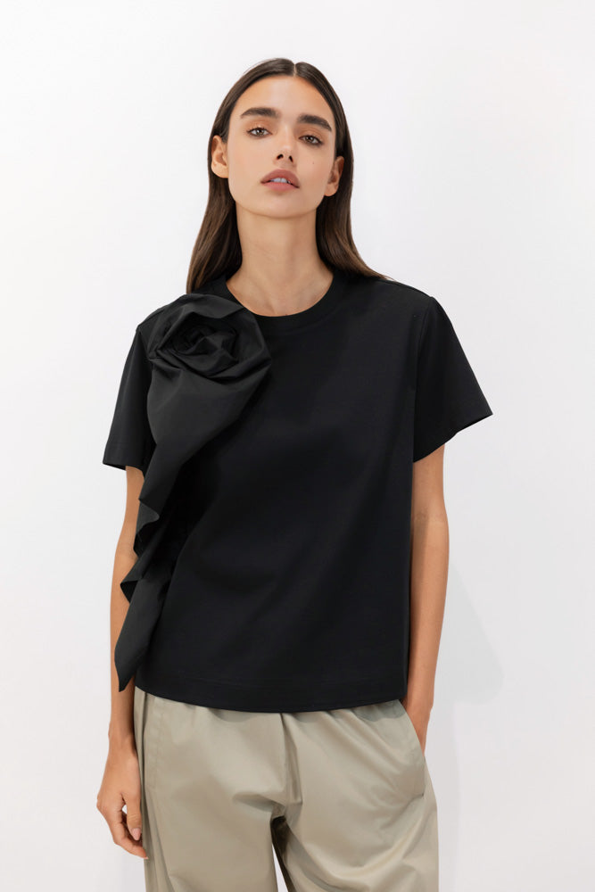 This T-shirt is crafted from soft, mercerized cotton with a lustrous finish. Its relaxed silhouette offers a fluid, contemporary drape, balancing comfort and elegance. Short sleeves enhance its laid-back feel, while the rosette detail on the shoulder adds a distinctive sculptural touch, complemented by a carefully crafted drape that creates volume and movement. An elevated essential, where the simplicity of cotton is transformed into an artistic expression.