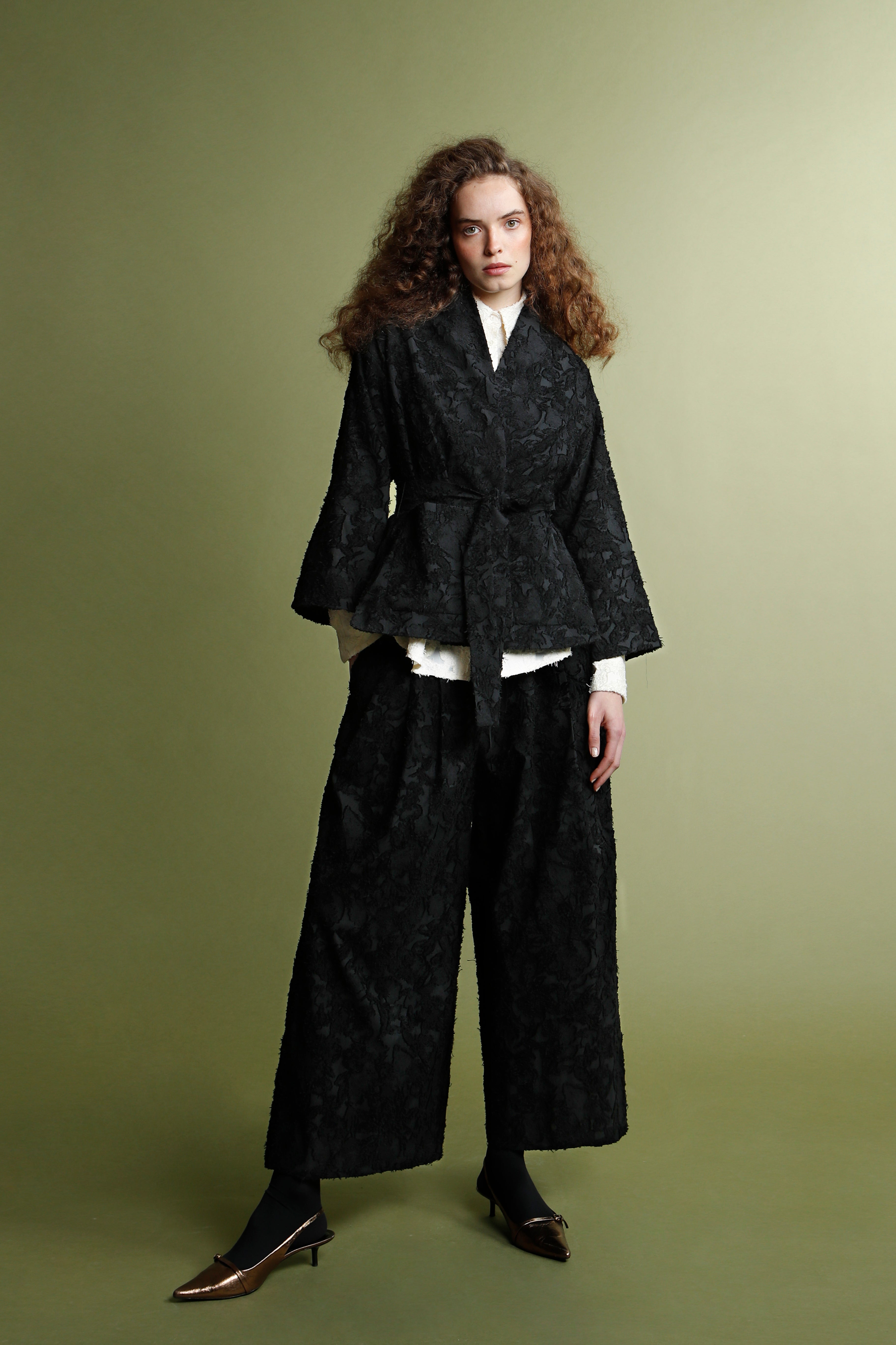 The Minimal Kimono Wrap Embroidered is a women's wrap kimono jacket that fuses Japanese tradition with a contemporary minimalist design featuring clean lines and a sophisticated essence. Its wrap silhouette is delicately cinched with a matching belt, providing structure without sacrificing fluidity or comfort.
