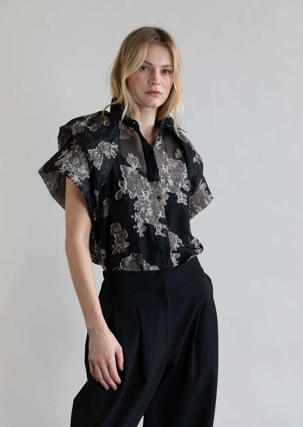 The Silver Bloom Blouse reinterprets the classic silhouette with a graphic and structural update. Featuring short, double-layered tulip sleeves, this piece introduces controlled volume and a precise construction that stands out with understated elegance.