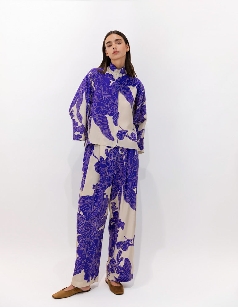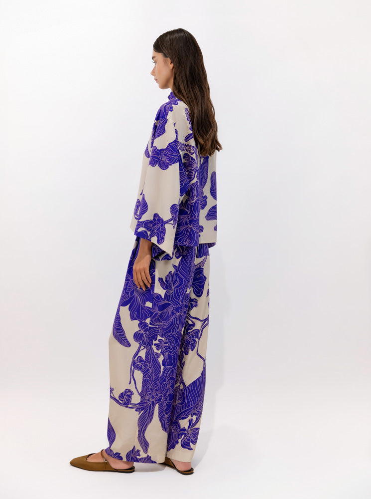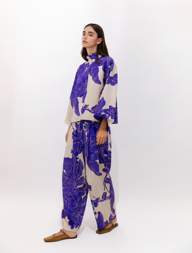 Palazzo -style trousers in CDC silk with the Orient Contour print, where stylized leaves and floral elements appear to glide gently across the fabric. Their comfortable, slightly adjustable waistband offers freedom of movement, while the wide, flowing legs create an elegant and natural gait.