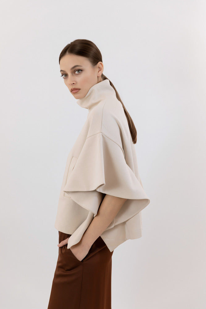 Poncho estructurado de manga butterfly con cuello alto y bolsillos laterales tipo side seam. Poncho estructurado de manga butterfly con cuello alto y bolsillos laterales tipo side seam.