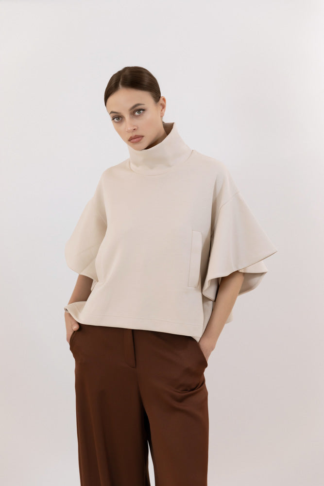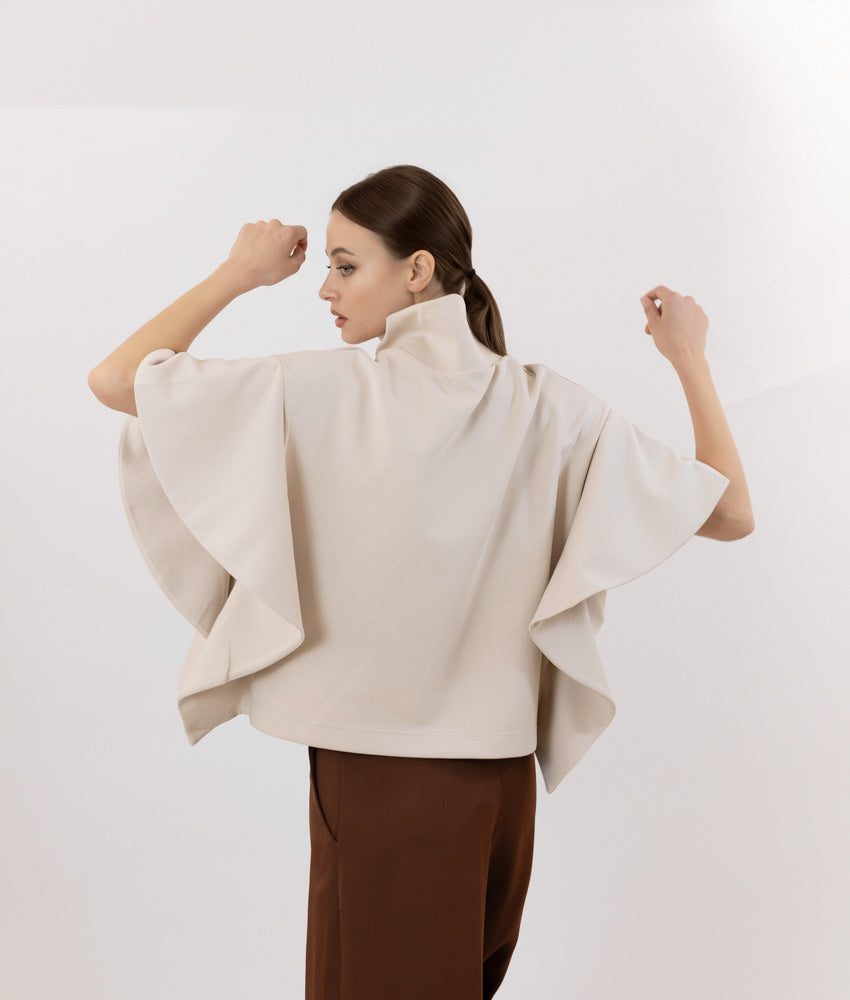 Este poncho estructurado de manga batwing (butterfly) combina comodidad y diseño vanguardista, ofreciendo una silueta amplia y fluida que aporta libertad de movimiento con un toque sofisticado. Su cuello alto añade calidez y elegancia, ideal para días frescos y para looks de layering contemporáneo.