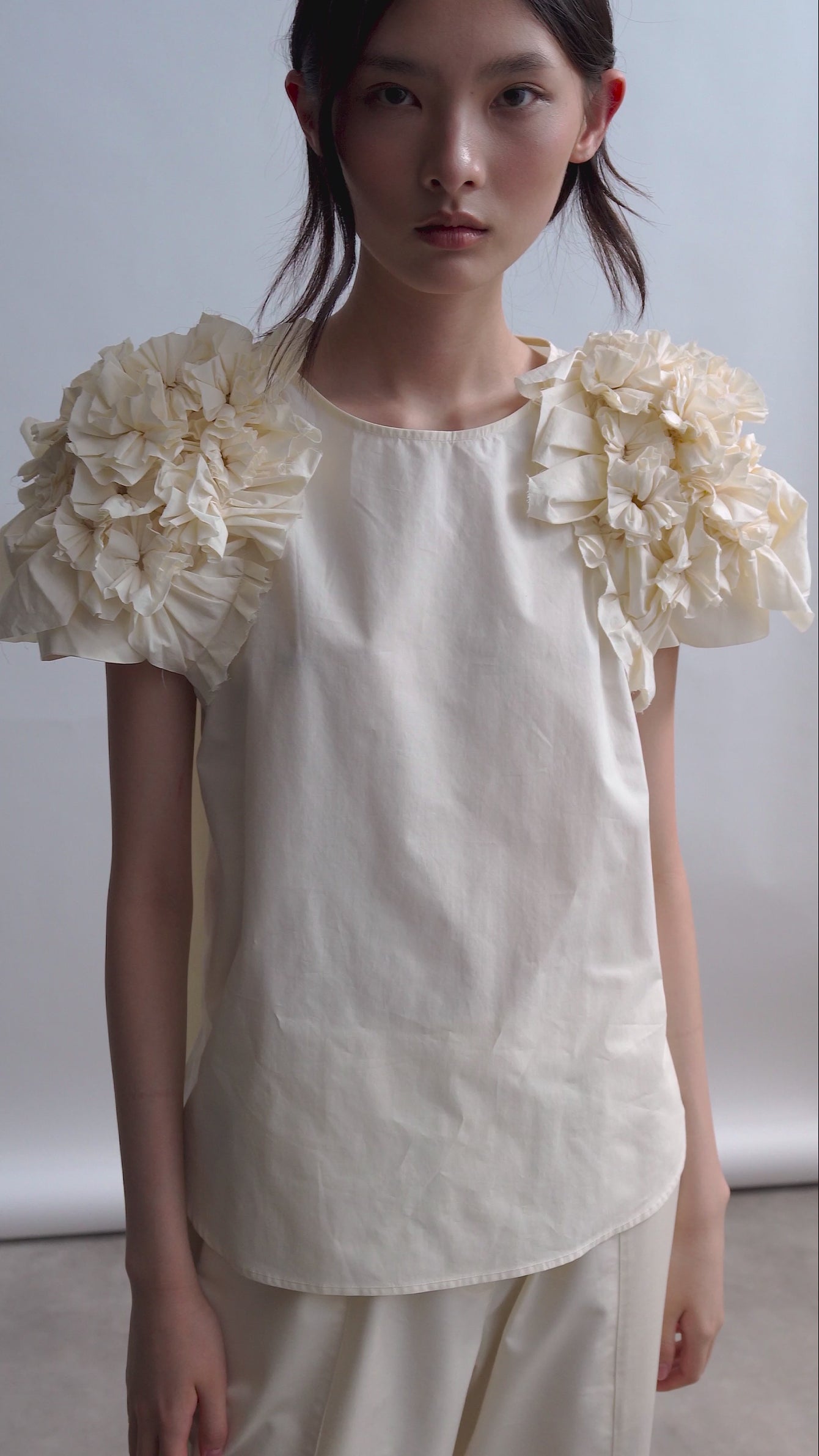 The distinctive feature of these pieces is their floral appliqués and origami details, the traditional Japanese art of paper folding to create figures, exclusive details from Psophia, creating organic reliefs that bring sophisticated volume to the garments.