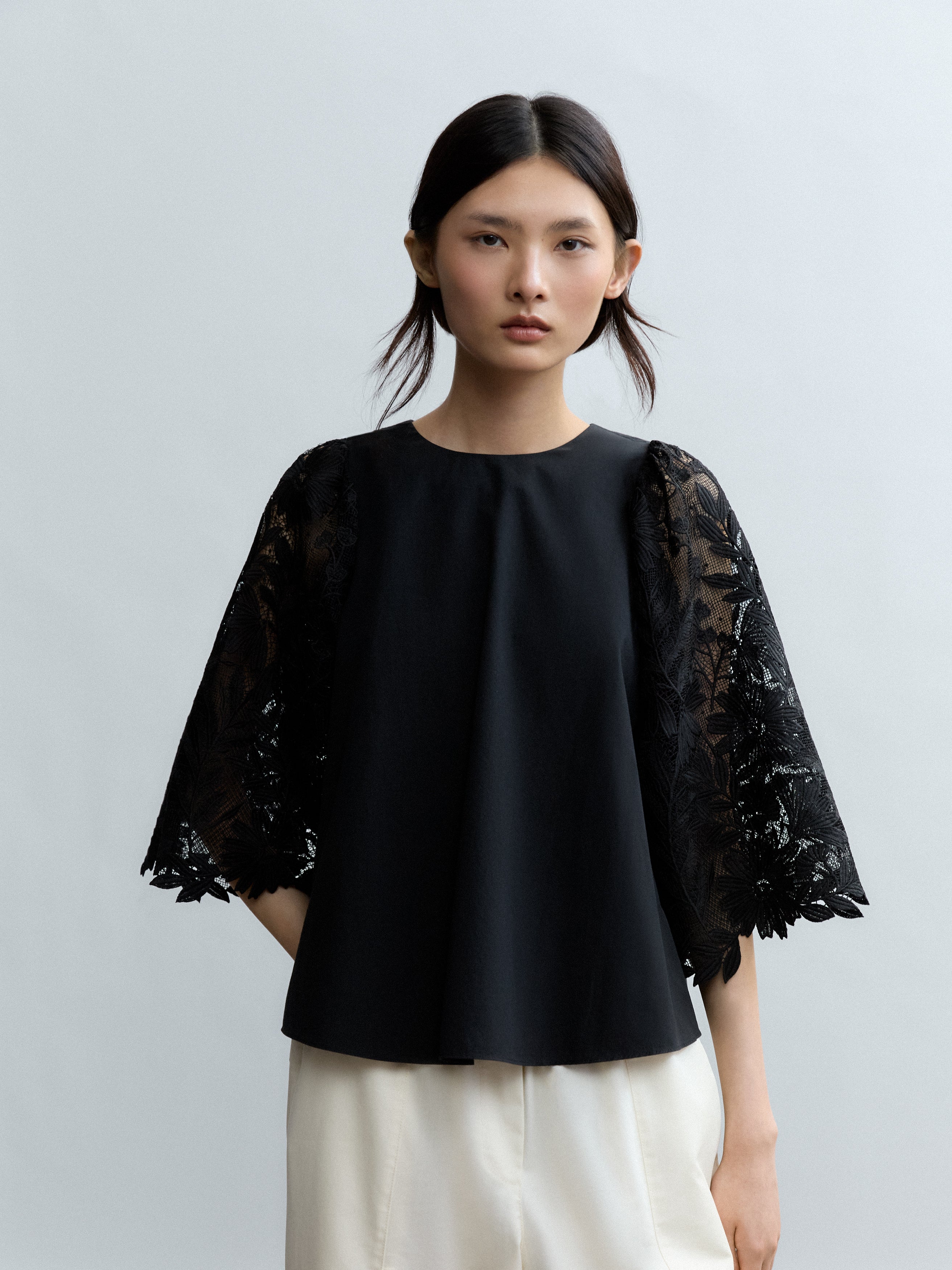 Blusa de silueta amplia que explora el volumen desde una construcción ligera y precisa. La pieza se define por sus mangas abullonadas, que introducen un gesto escultórico y envolvente.