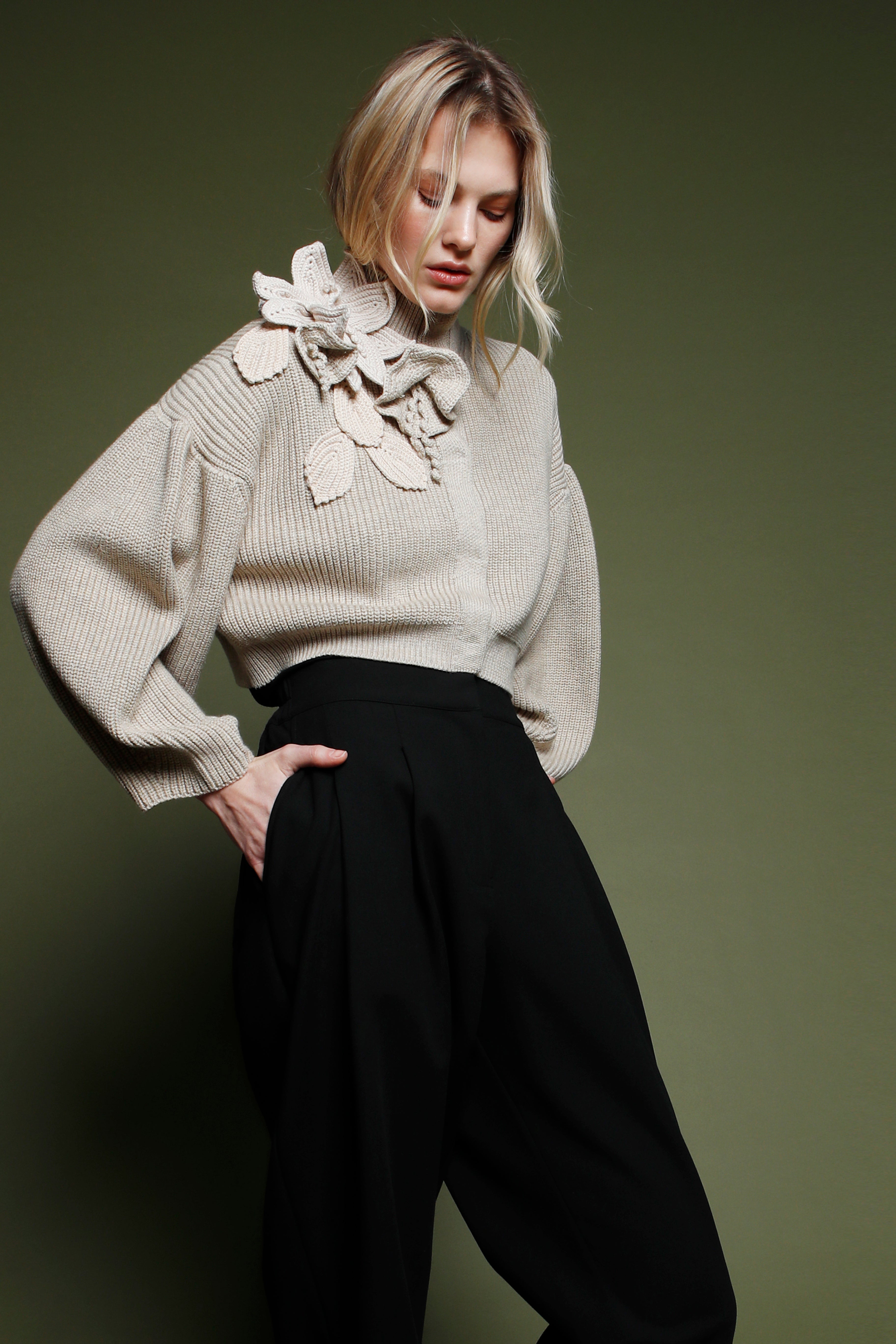 This funnel-neck cardigan combines elegance and trendiness in a unique piece. Its bishop sleeves add volume and movement, while the woven floral detail adds a delicate, handcrafted touch that enhances the design's femininity.