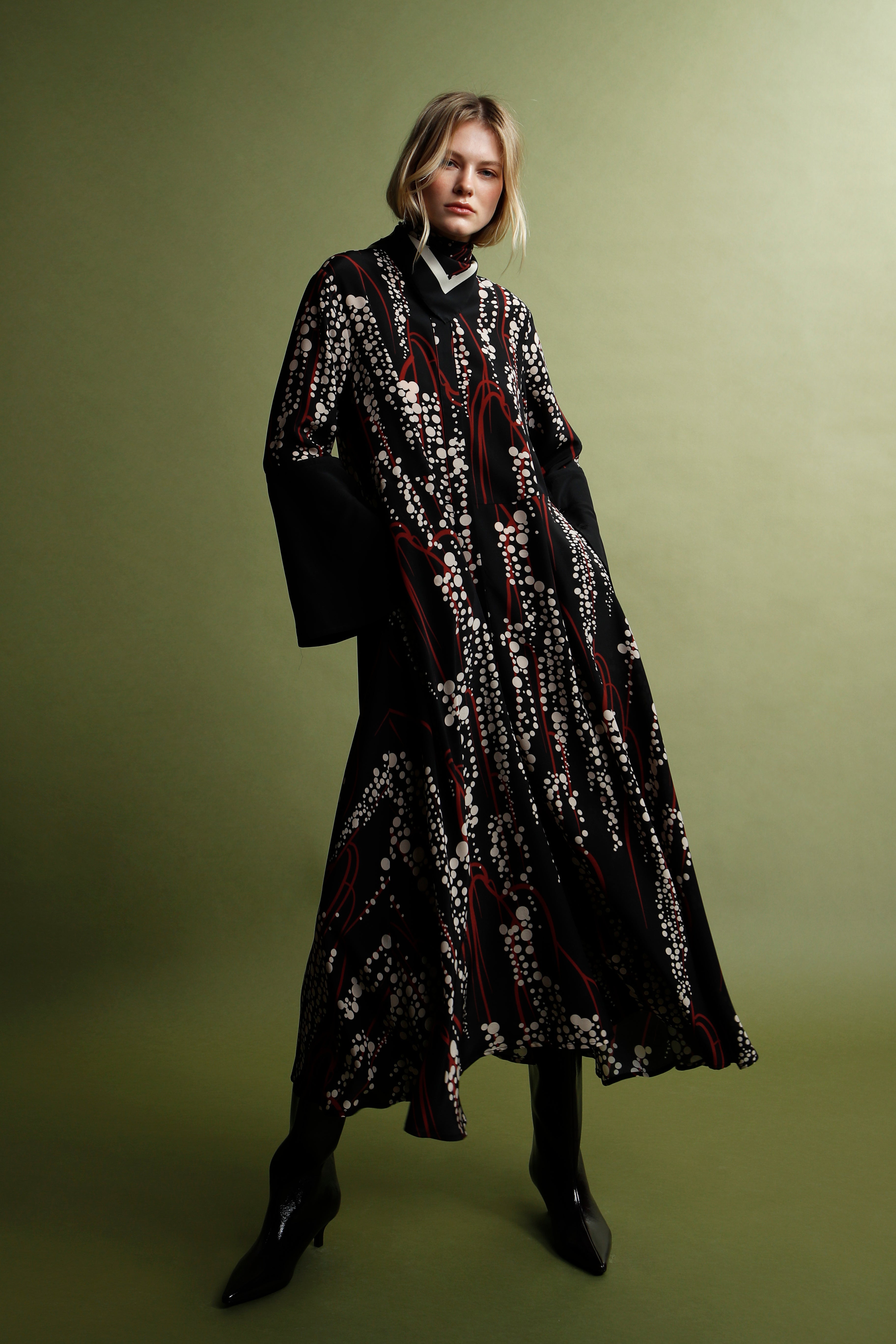 Confeccionado en un tejido fluido de excelente caída, su silueta tipo túnica en A incorpora un cuello anillado, mangas largas con puños contrastantes y un estampado exclusivo inspirado en el arte gráfico de los años 60. Sobre un fondo negro intenso, líneas ondulantes en burdeos dibujan el ritmo de una constelación de círculos en blanco crema, creando un efecto visual elegante, moderno y dinámico.