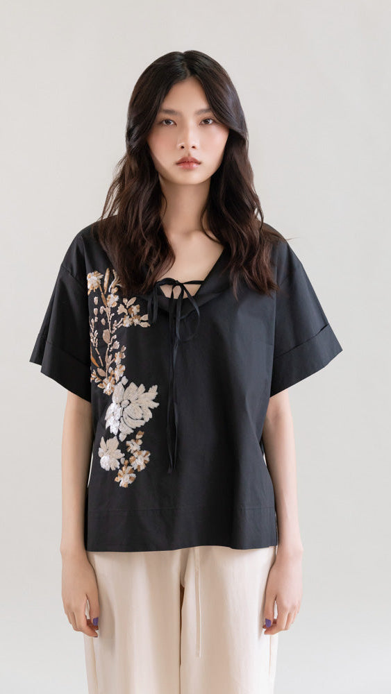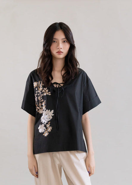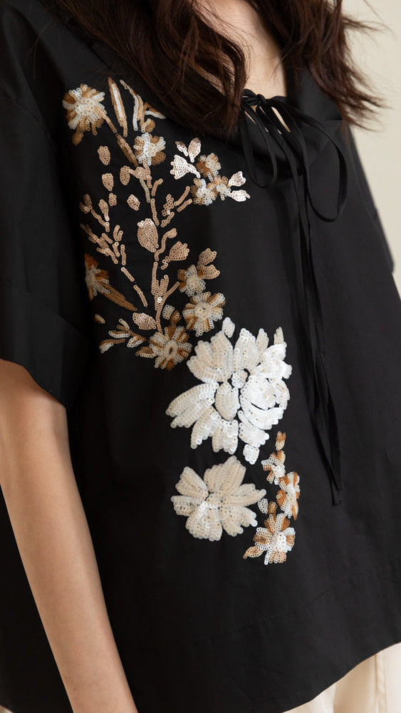Embroidered Poplin Shirt with Sequins and Notch Collar