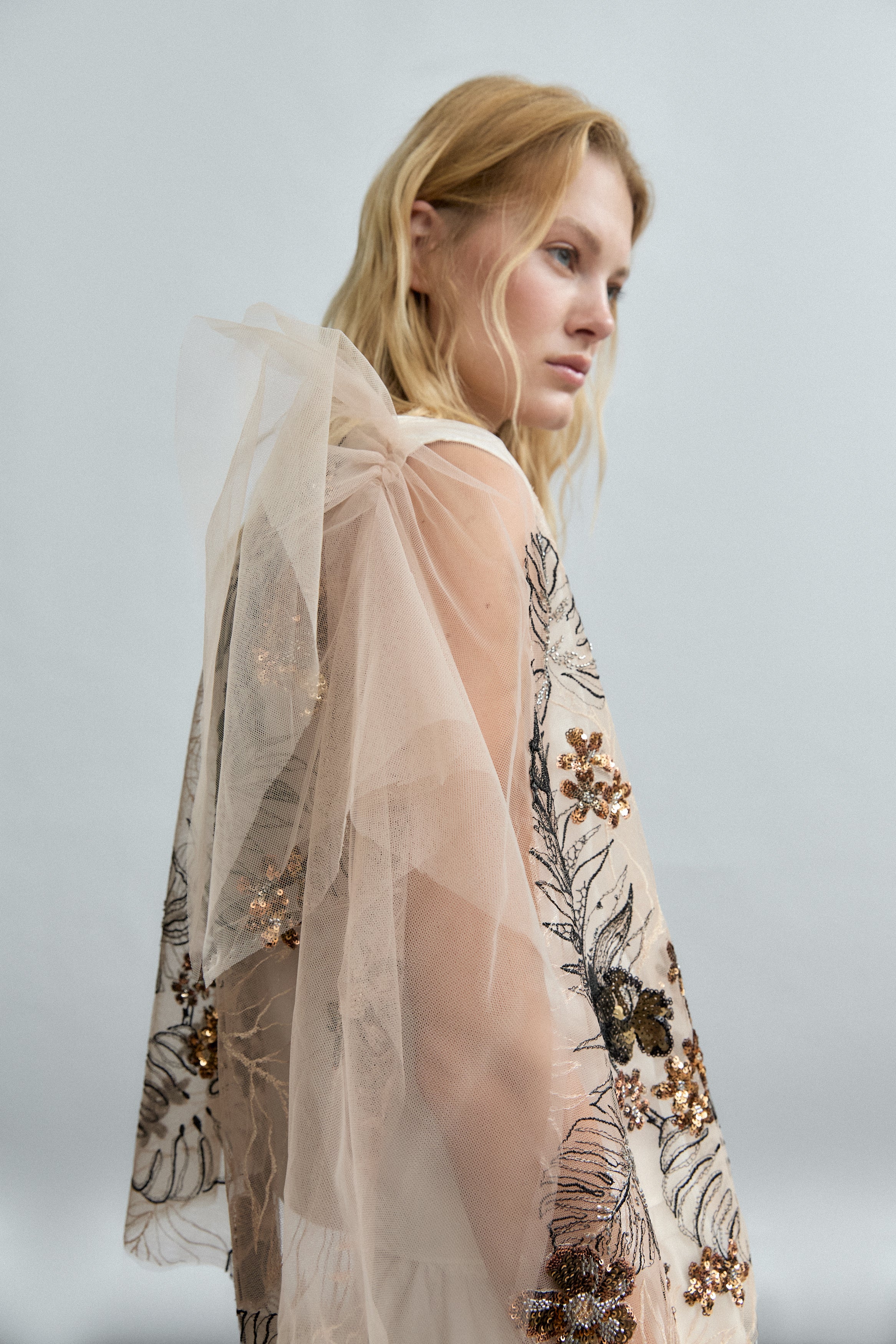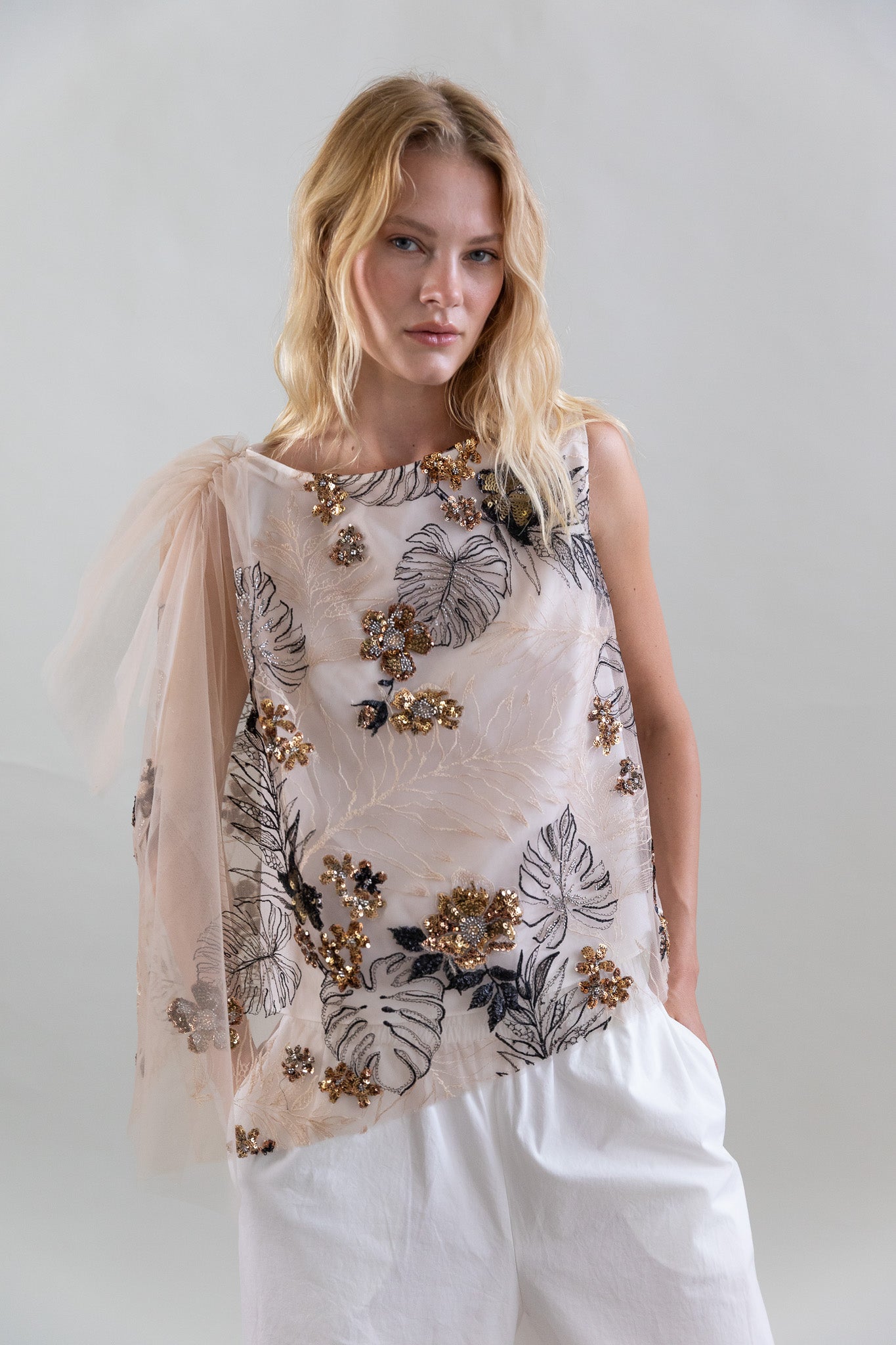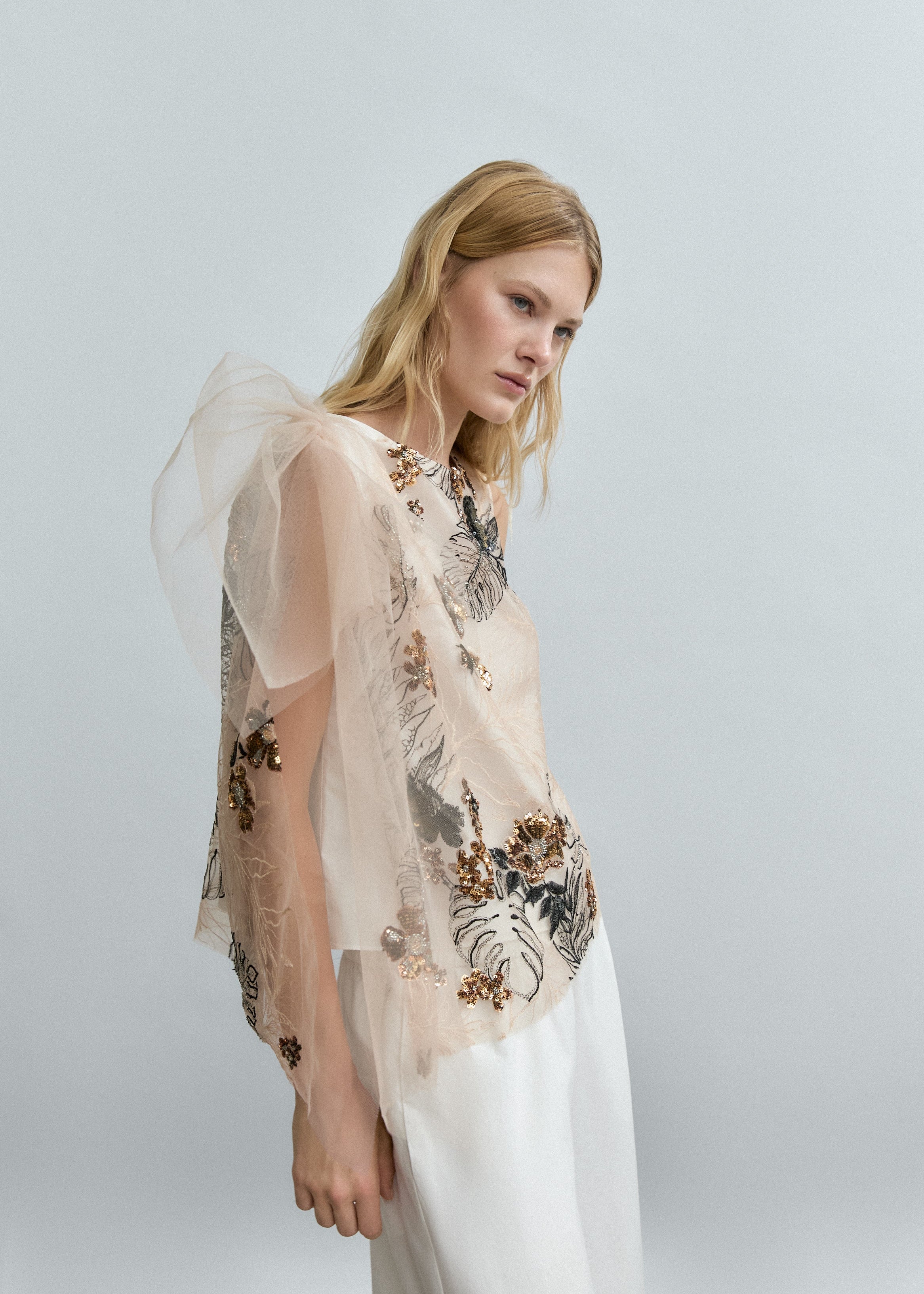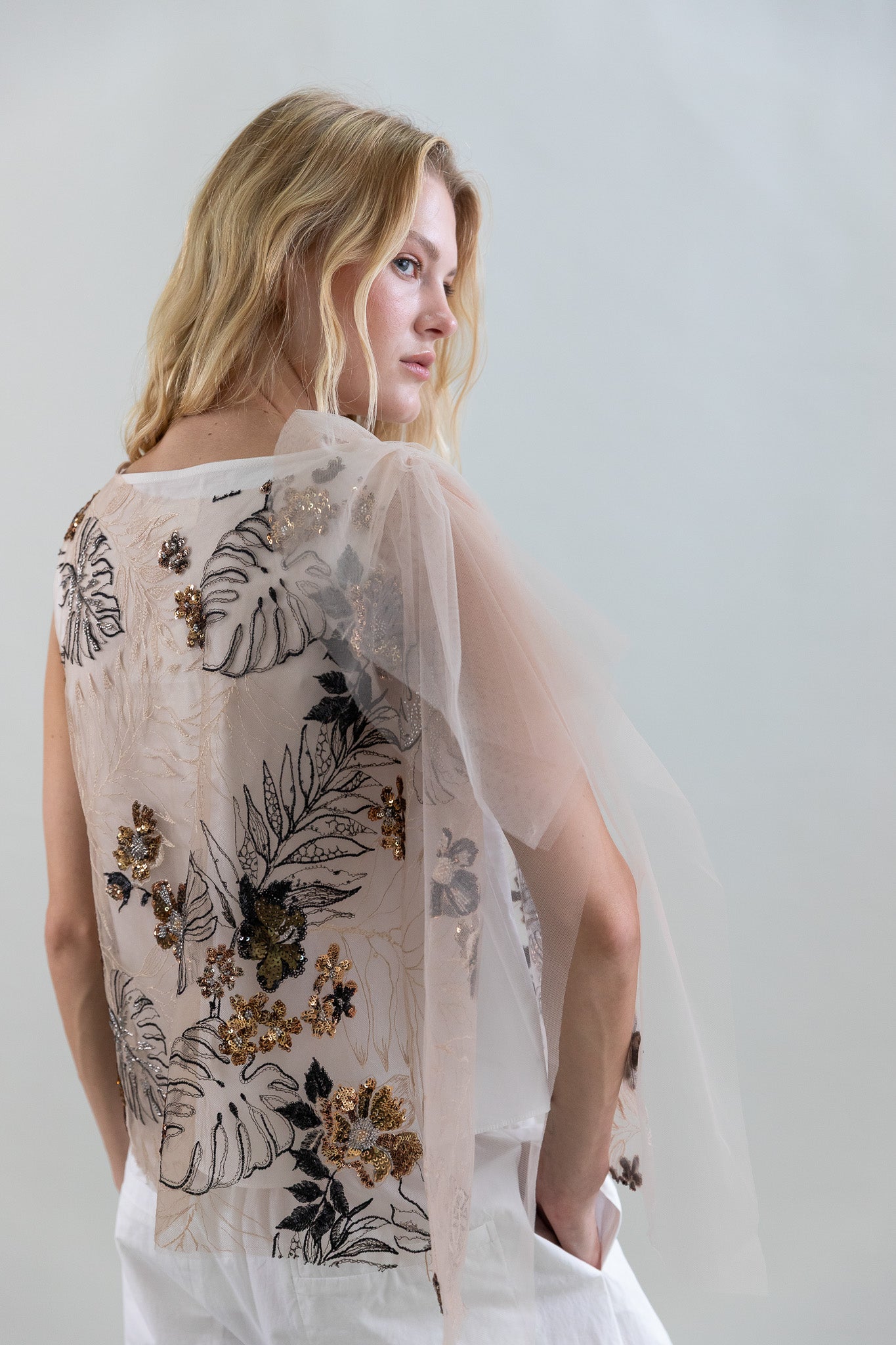 Embroidered Tulle Top with Sequins and Gathered Shoulders