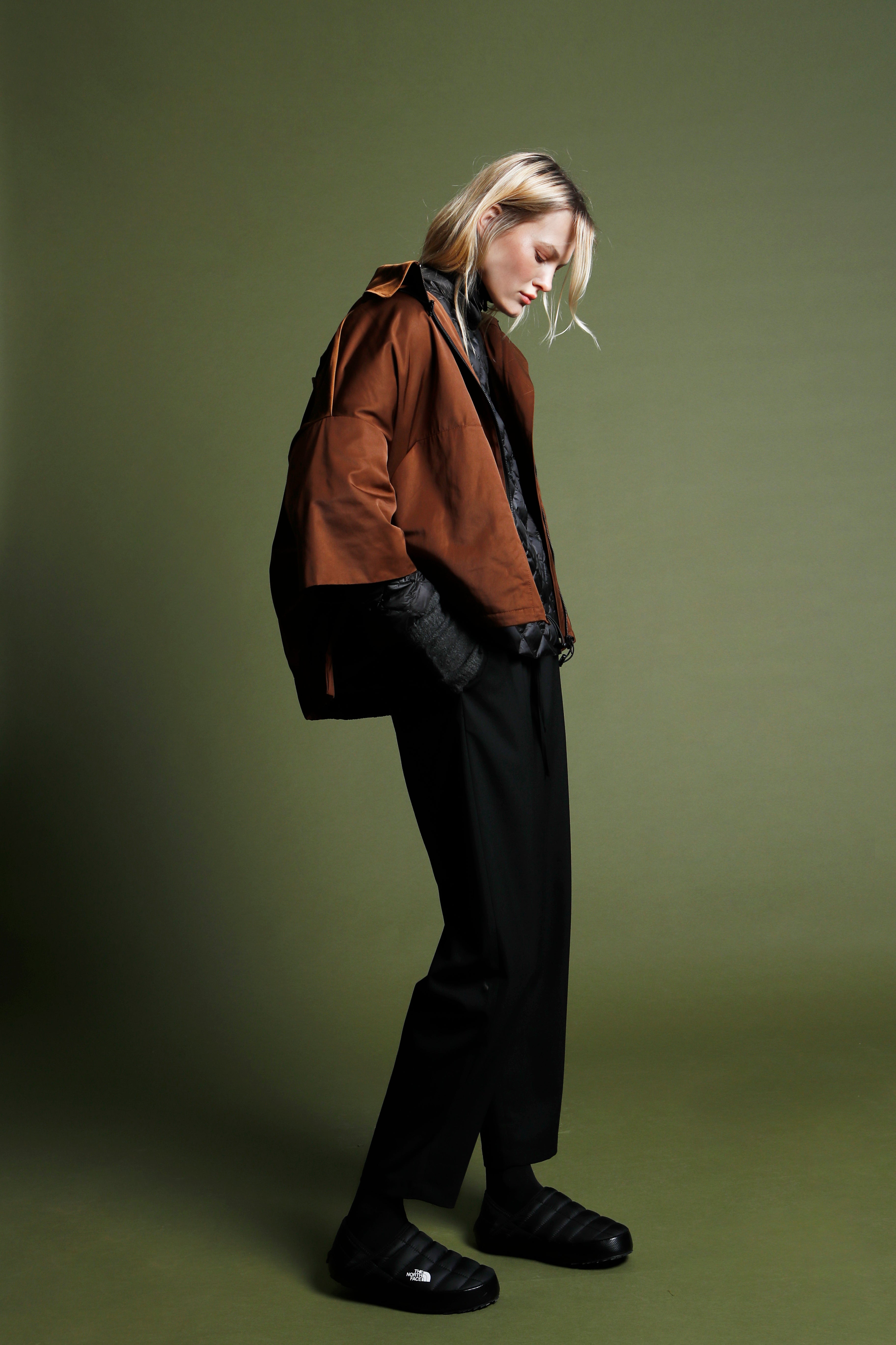 La capucha integrada añade un guiño práctico al diseño, mientras que las mangas anchas al codo generan un contraste visual interesante, aportando amplitud y movimiento a la prenda.