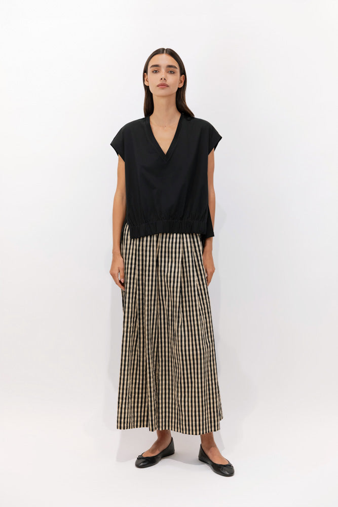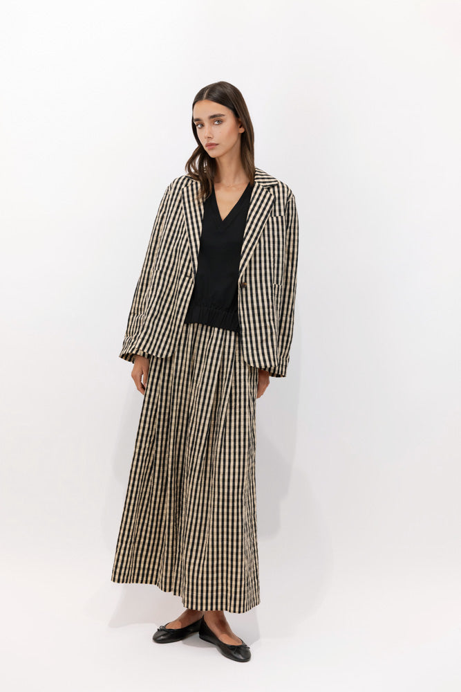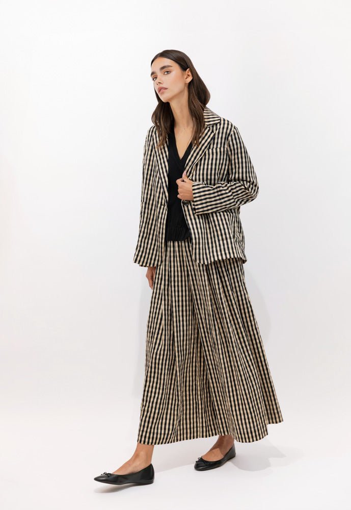 La caída amplia de la pernera crea un movimiento ligero y natural, manteniendo un equilibrio perfecto entre fluidez y definición. El mini gingham introduce un detalle gráfico delicado que armoniza con la chaqueta a juego, creando un conjunto fresco con carácter preppy y espíritu estival.