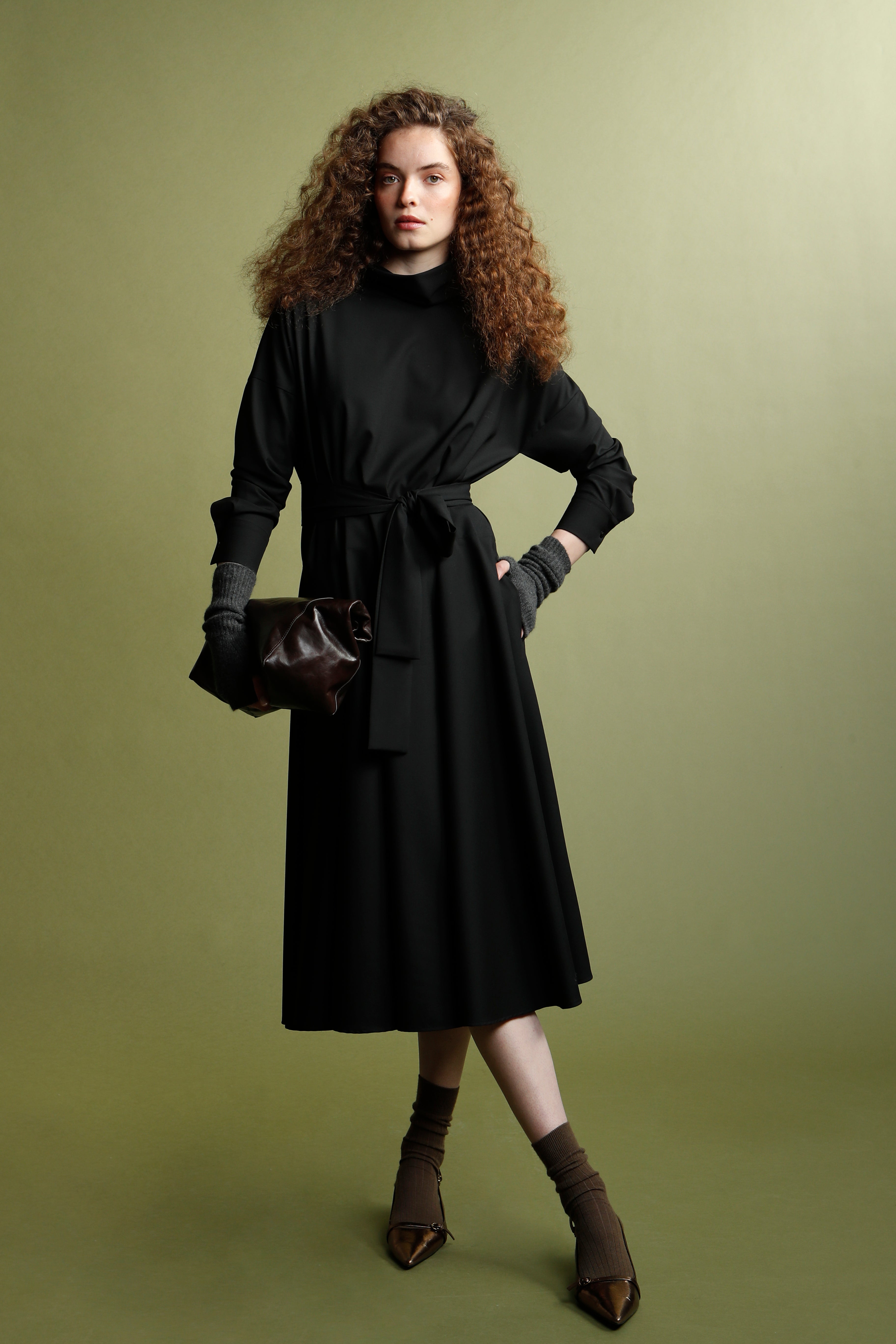 El High Grace Flared Dress eleva la silueta clásica a través de un enfoque depurado y contemporáneo. El diseño se articula alrededor de un cuello alto, estilizado y limpio, que aporta una presencia escultural y enmarca con delicadeza la línea del rostro. Las mangas largas, rematadas con un puño abotonado, introducen un detalle sutil que equilibra elegancia y funcionalidad.