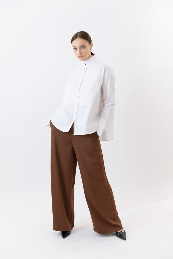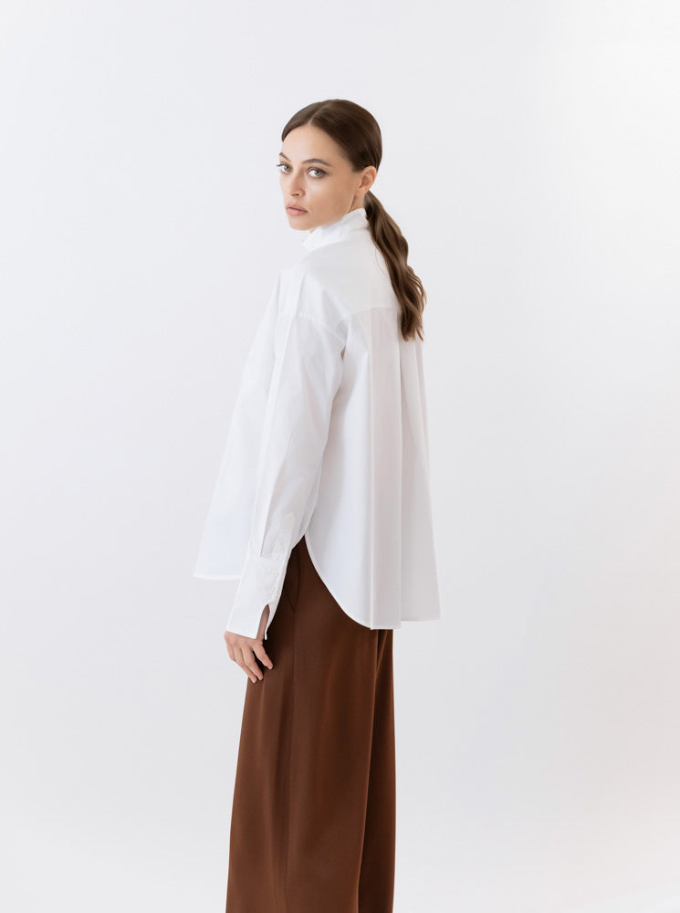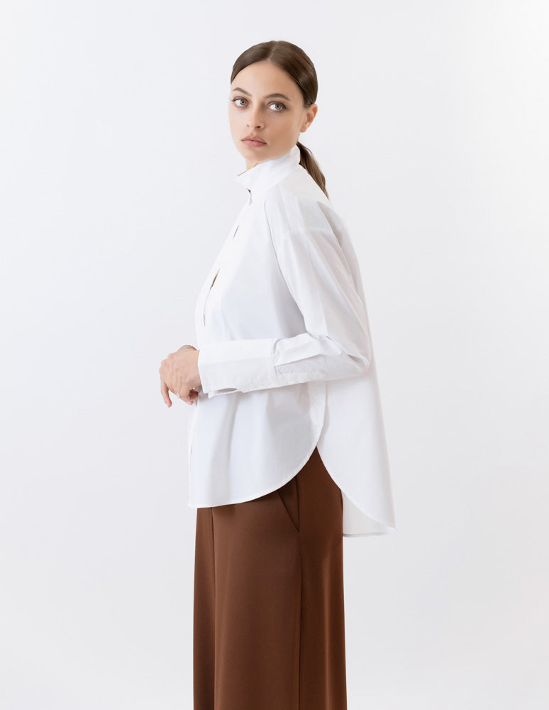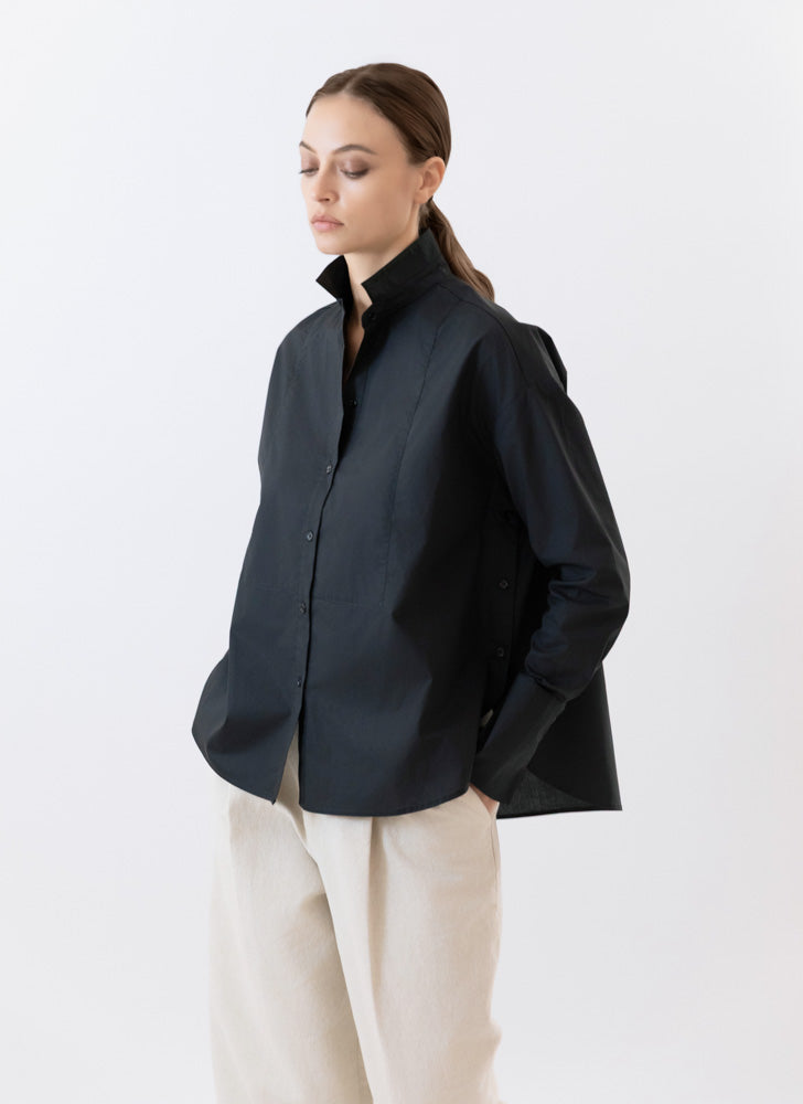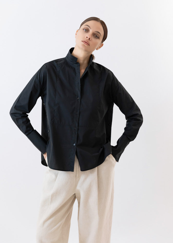 La Front Gather Double Cuff Shirt destaca por su elegante bib front —un panel delantero estructurado que aporta profundidad y sofisticación al diseño. Este detalle añade un sutil juego de pliegues que realzan la silueta y mantienen la limpieza de las líneas.