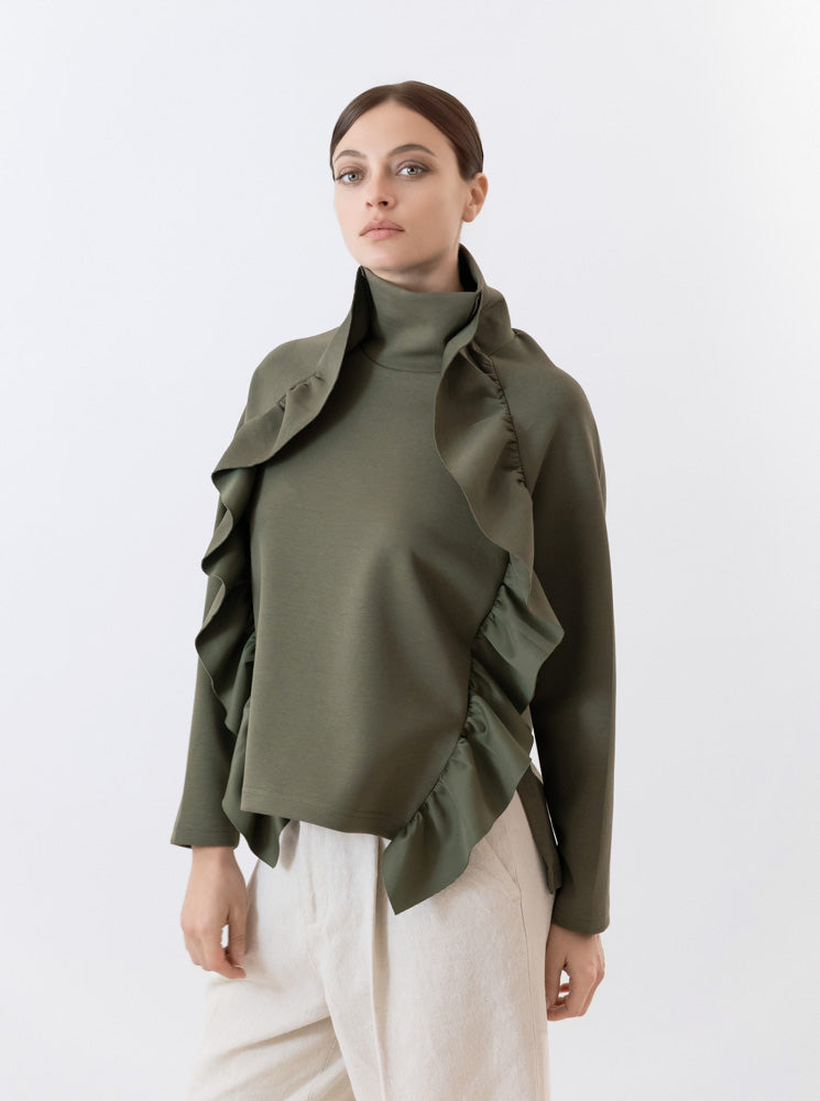 Top de Cuello Funnel con Manga Raglán y Detalle en Cascada – Diseño Escultural con Caída Lateral Sofisticada
