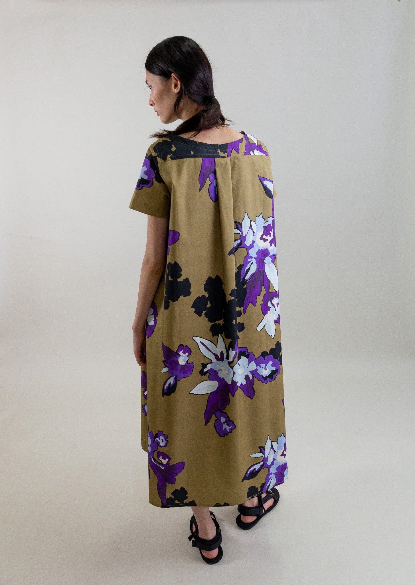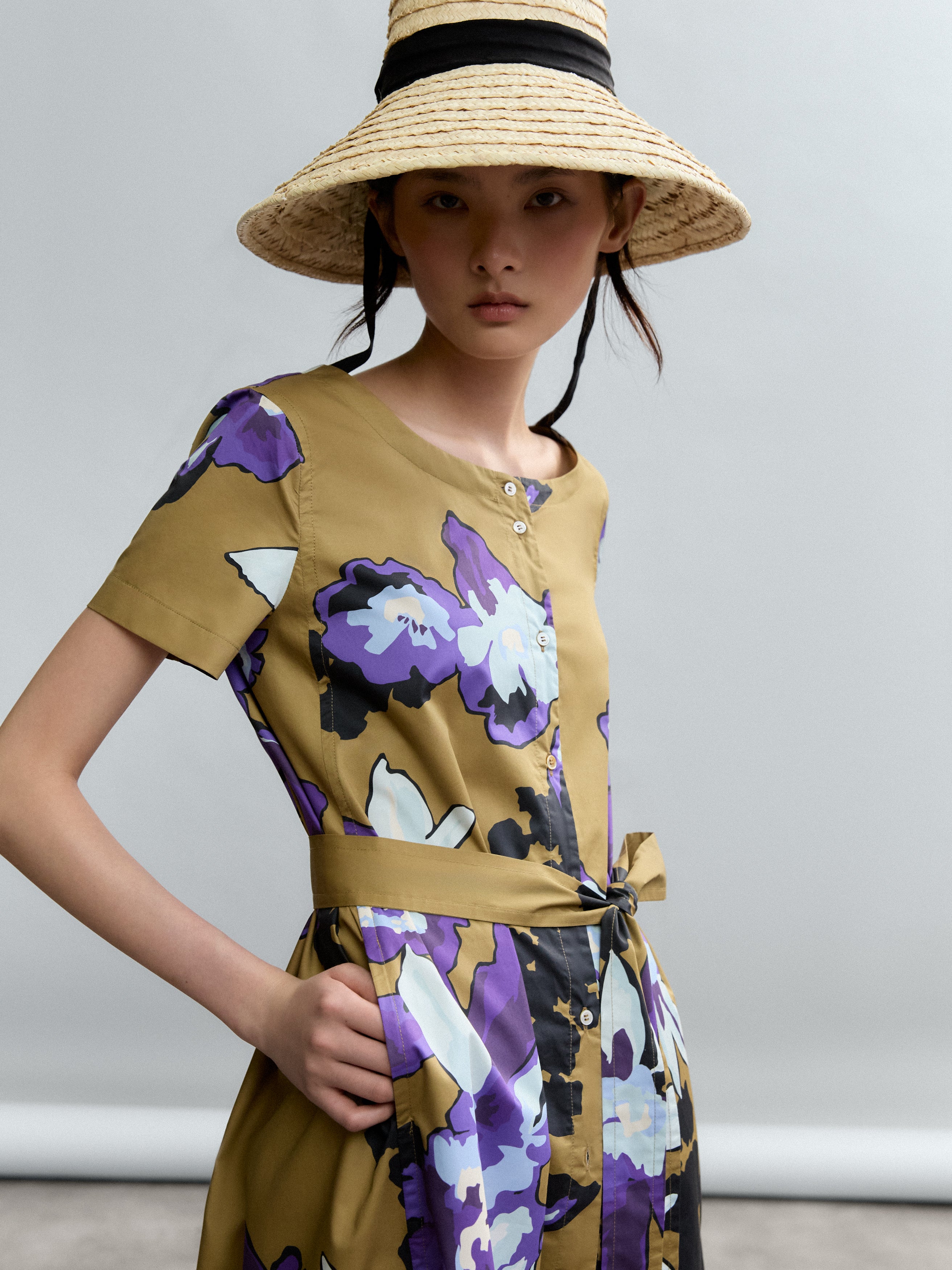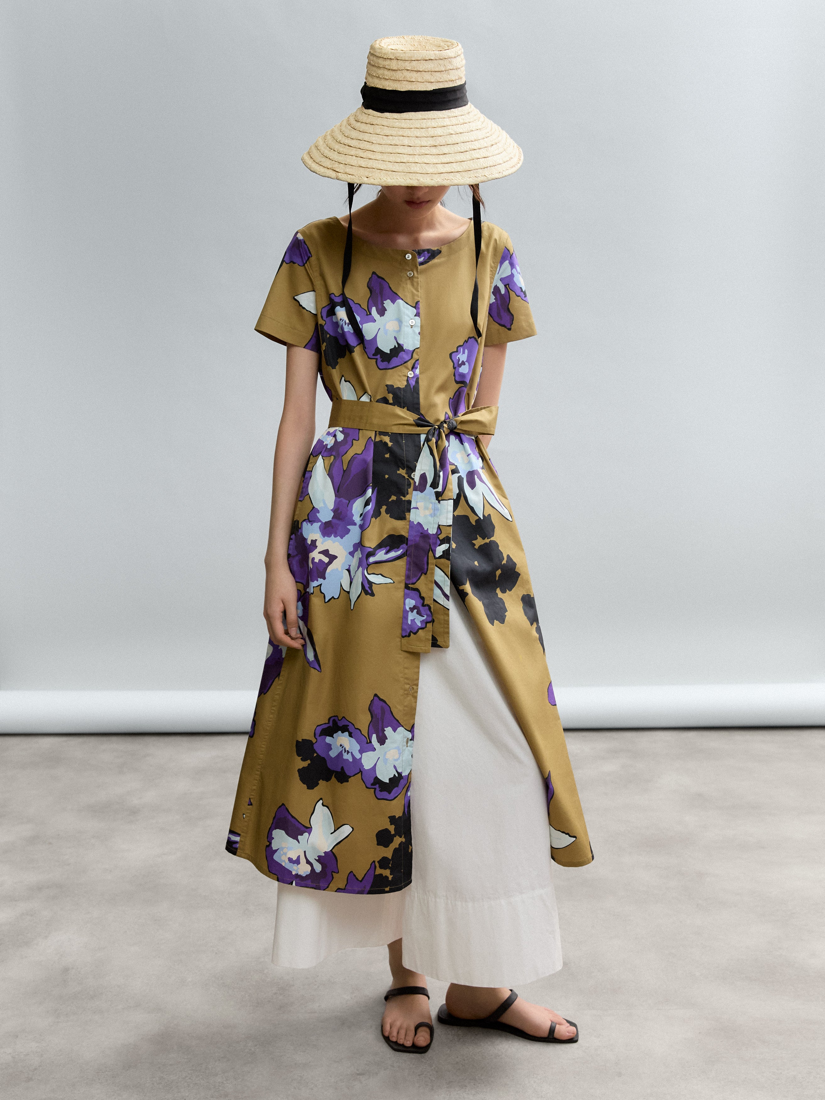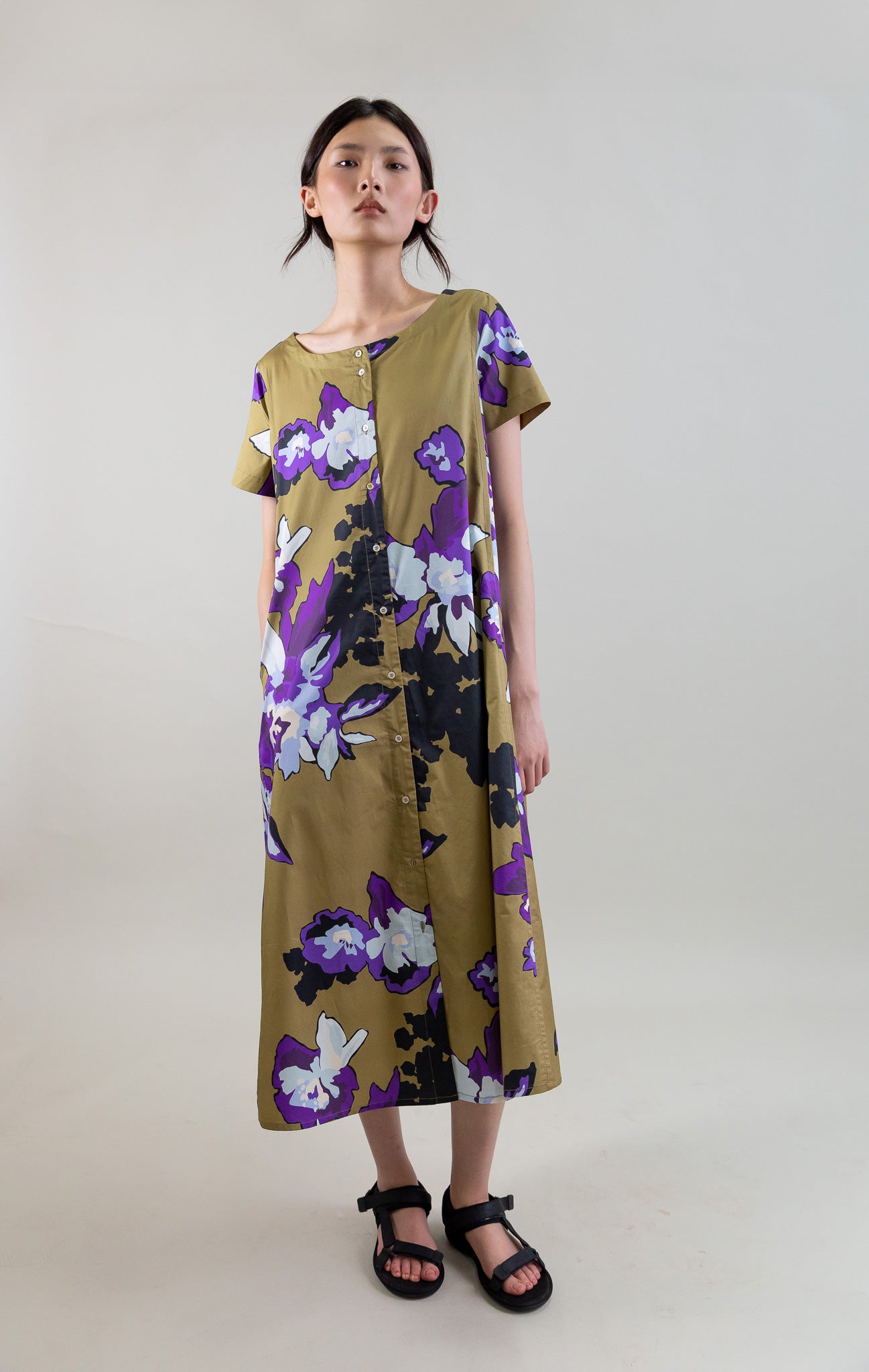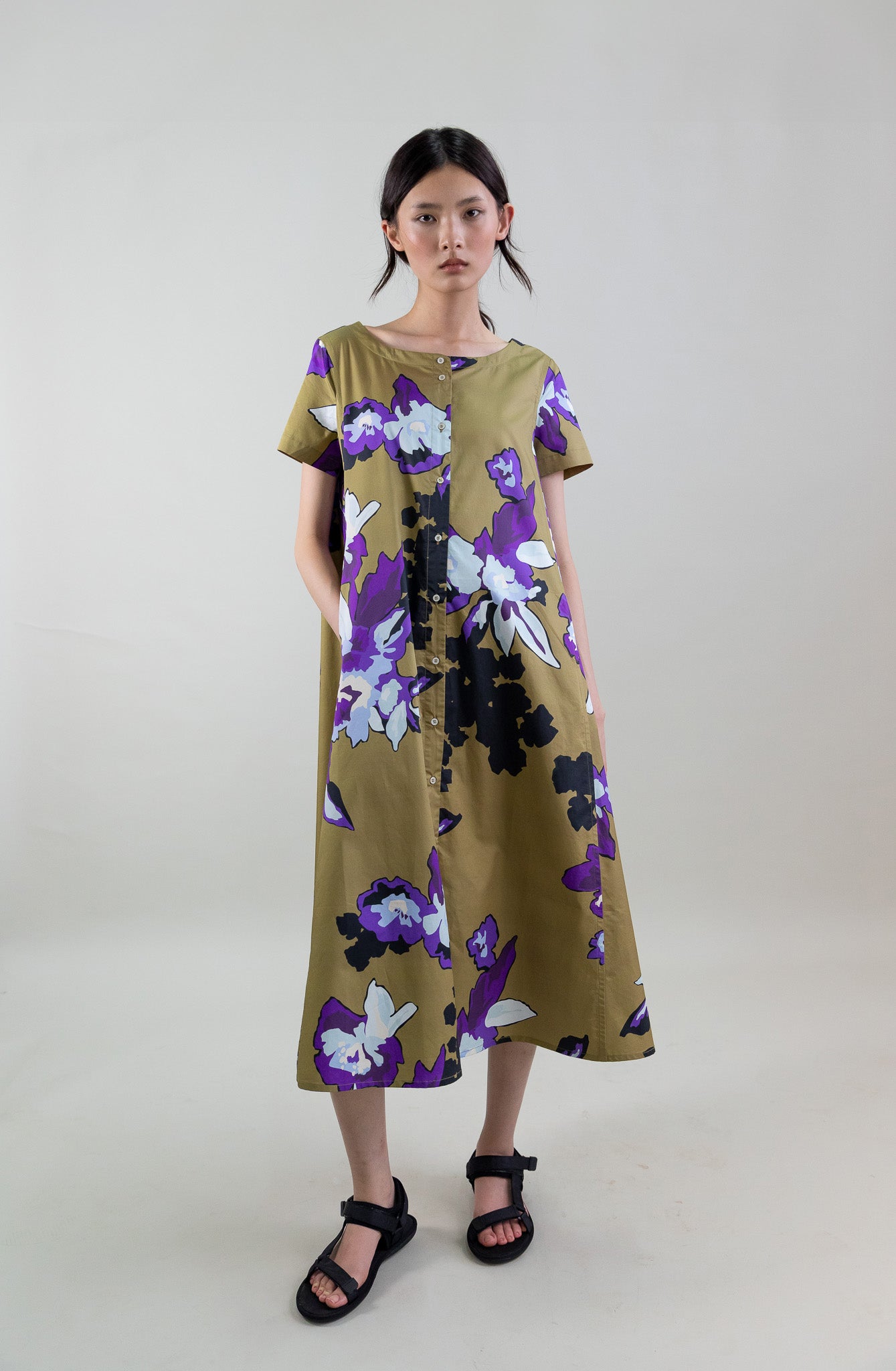 El Orchid Canvas Button-Front Midi Dress es un vestido midi camisero de inspiración artística que redefine la elegancia contemporánea. Confeccionado en algodón satinado premium, destaca por su estampado floral de gran formato en contraste sobre base ocre, aportando profundidad, y una identidad visual única.