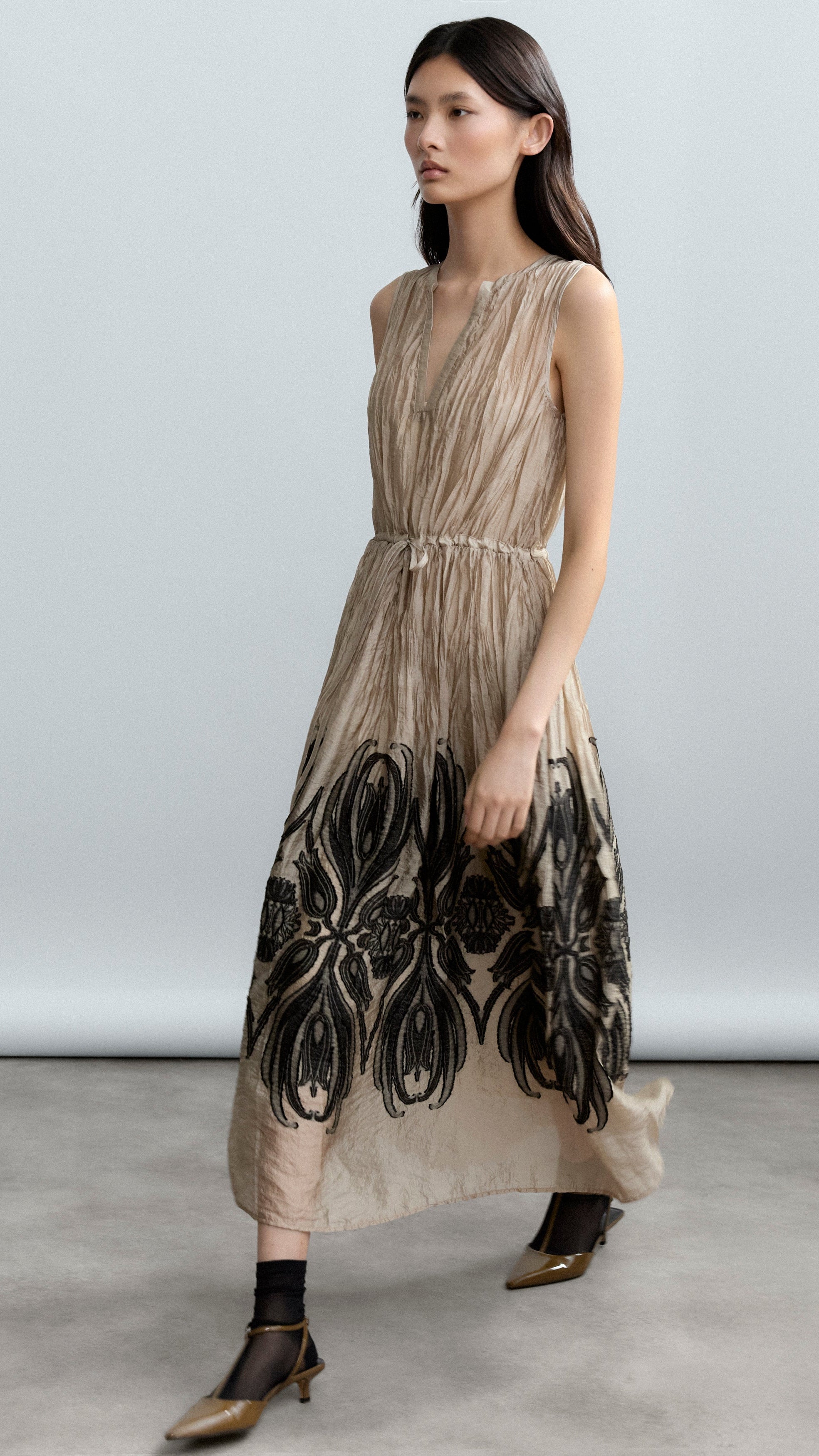 Este vestido sin mangas presenta un escote en V y un corte fruncido en la cintura, que define la silueta de manera favorecedora, mientras que la falda A-line o evasé aporta movimiento y ligereza al conjunto.