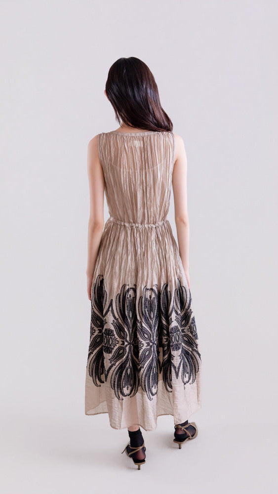 El detalle protagonista se encuentra en la falda, donde un delicado appliqué aporta textura y un efecto tridimensional, evidenciando un trabajo artesanal y un acabado de alta calidad. Los motivos, inspirados en flores y hojas estilizadas, se presentan en negro sobre un fondo claro (beige o crema), creando un contraste elegante y sofisticado.