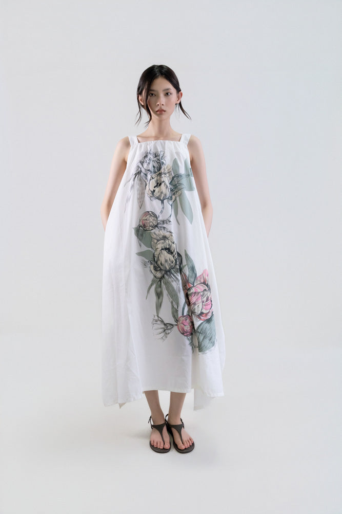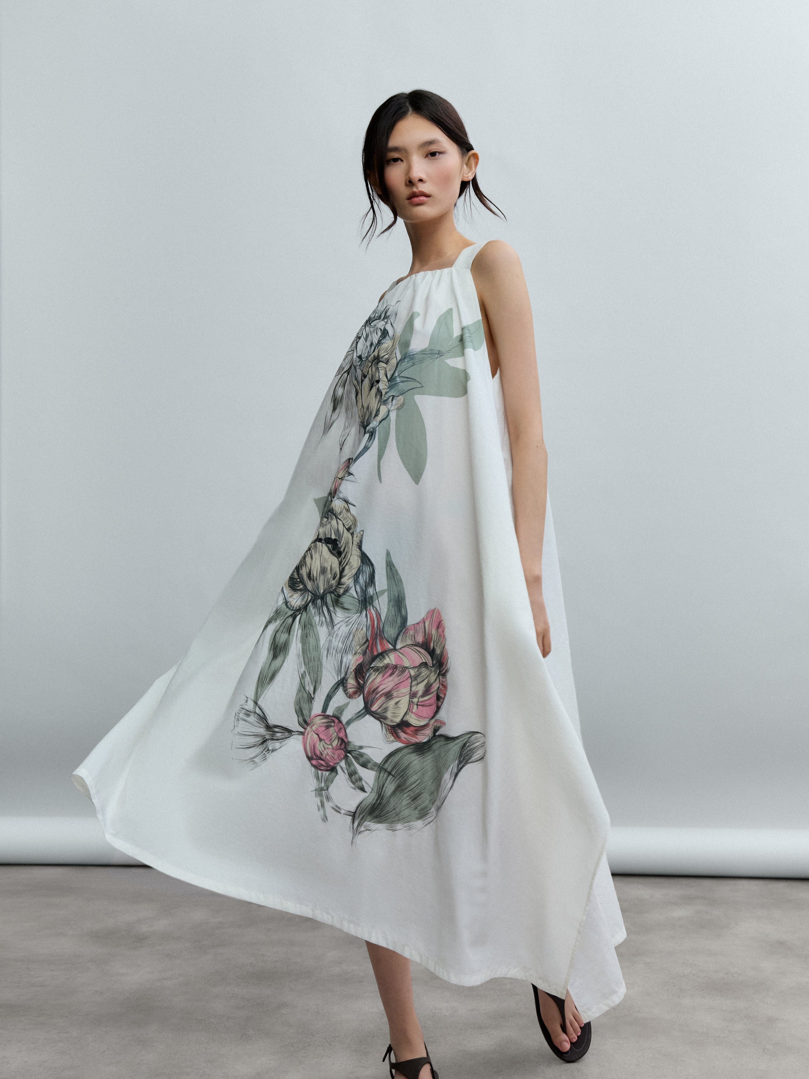 El estampado Muted Peony Study refuerza la identidad artística de la prenda: peonías interpretadas en trazos de lápiz y tonos apagados, creando un contraste armónico entre el diseño contemporáneo y la sensibilidad ilustrada del print.