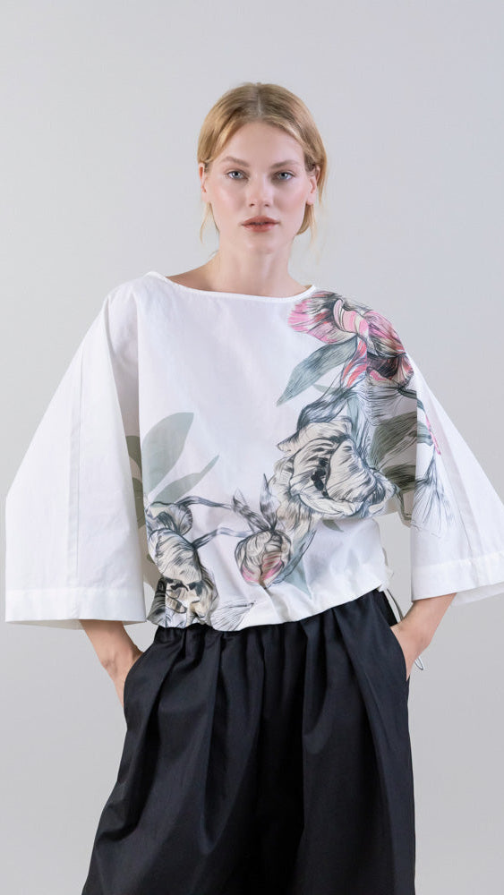 El estampado, con peonías en distintas etapas de floración, renderizado en trazos lápiz y tonos suaves, aporta un carácter artístico y poético Una pieza versátil que funciona tanto para looks casuales refinados como para estilismos más cuidados, manteniendo la coherencia estética y sensorial de la línea.