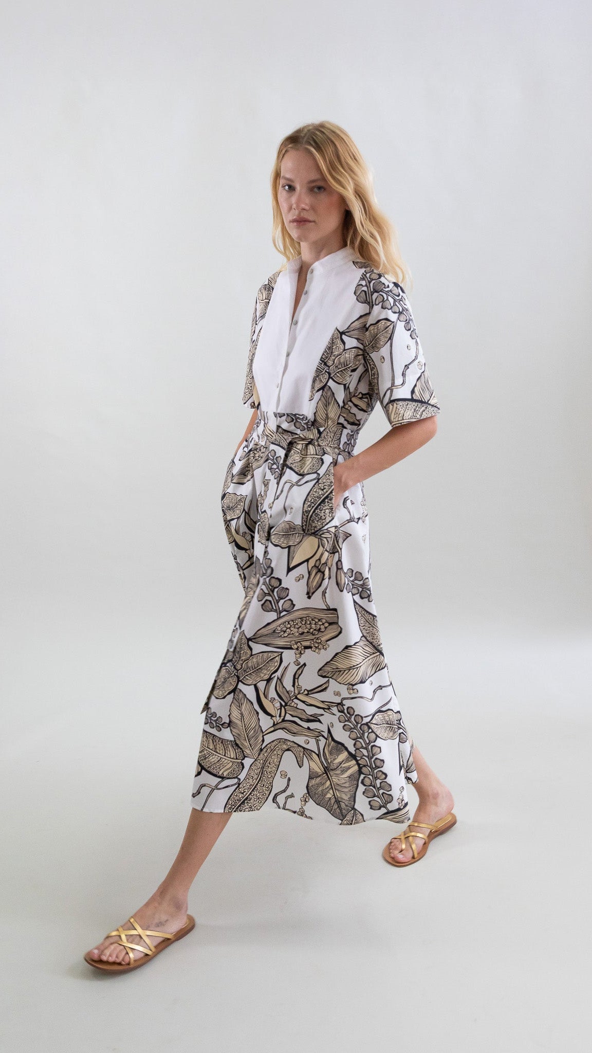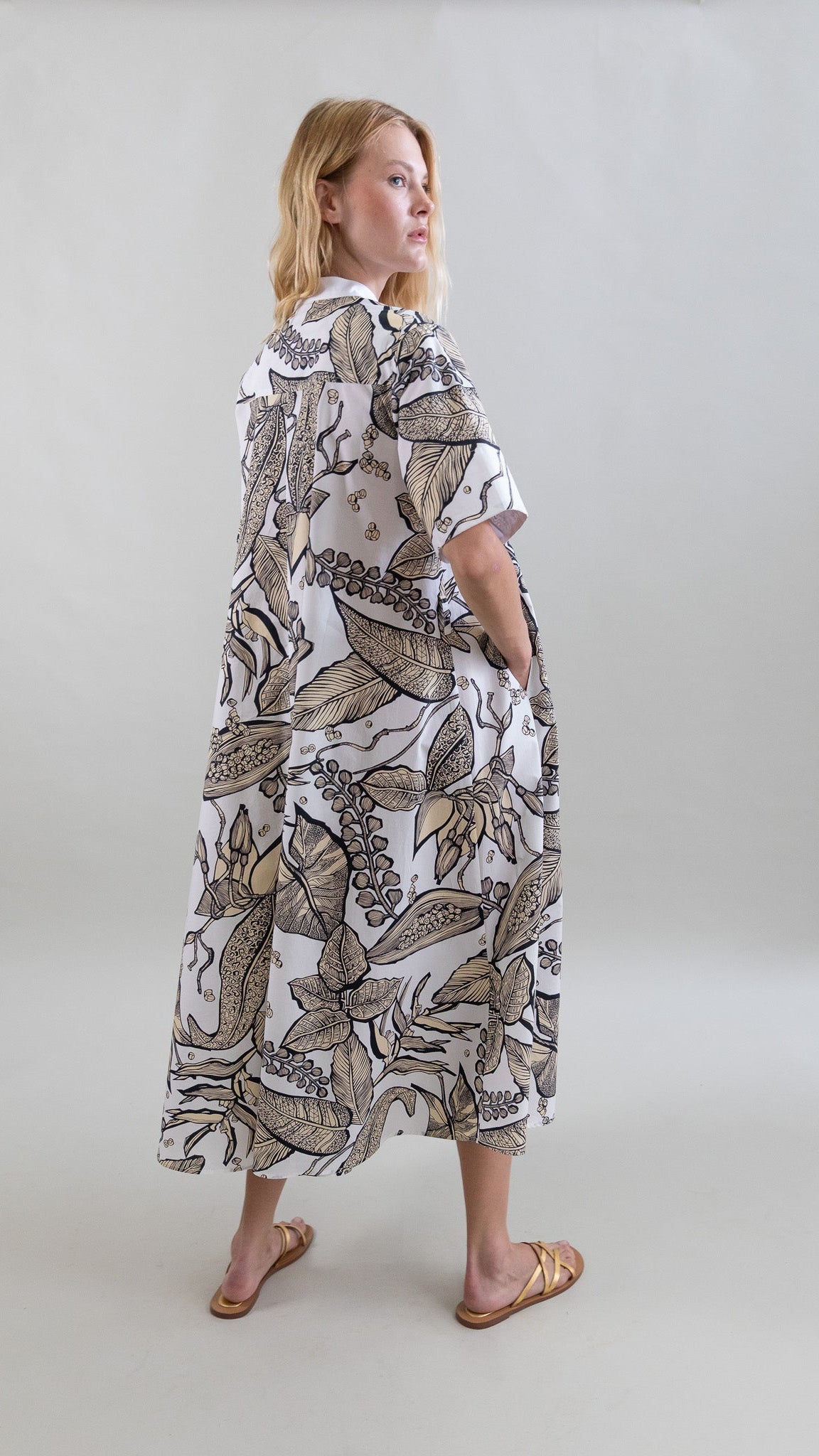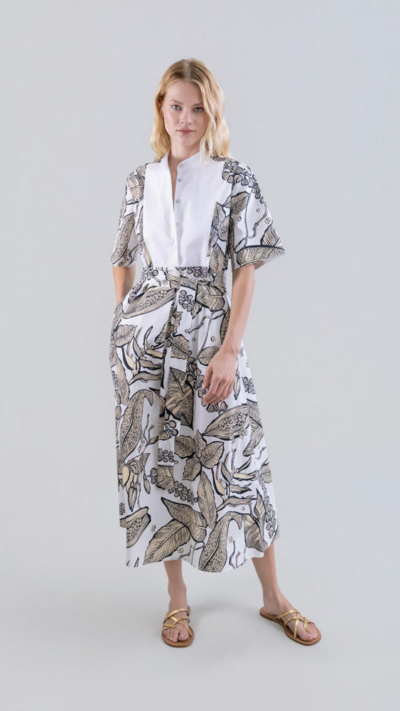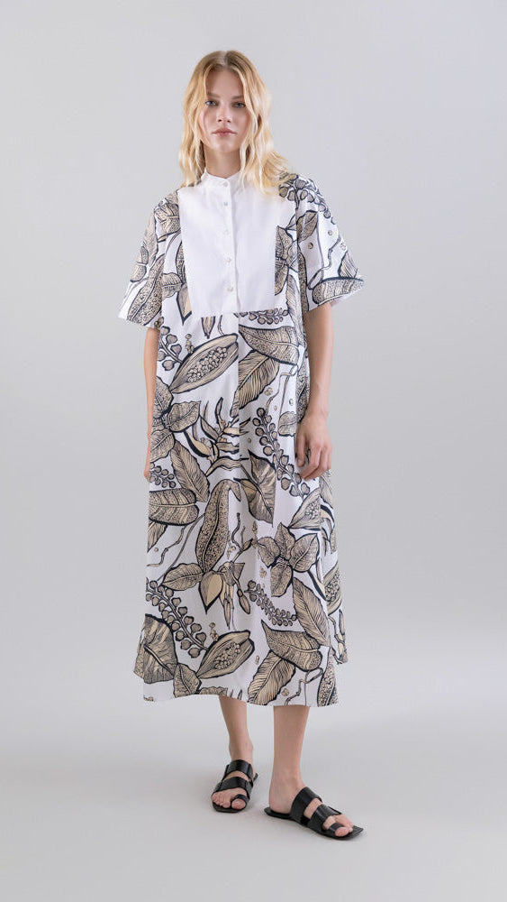 Este vestido largo en Retro Bloomleaf combina un estampado elegante y natural con una silueta fluida y femenina. El cuello bib tipo mao aporta estructura discreta al torso, mientras que las mangas cortas permiten libertad de movimiento y ligereza.