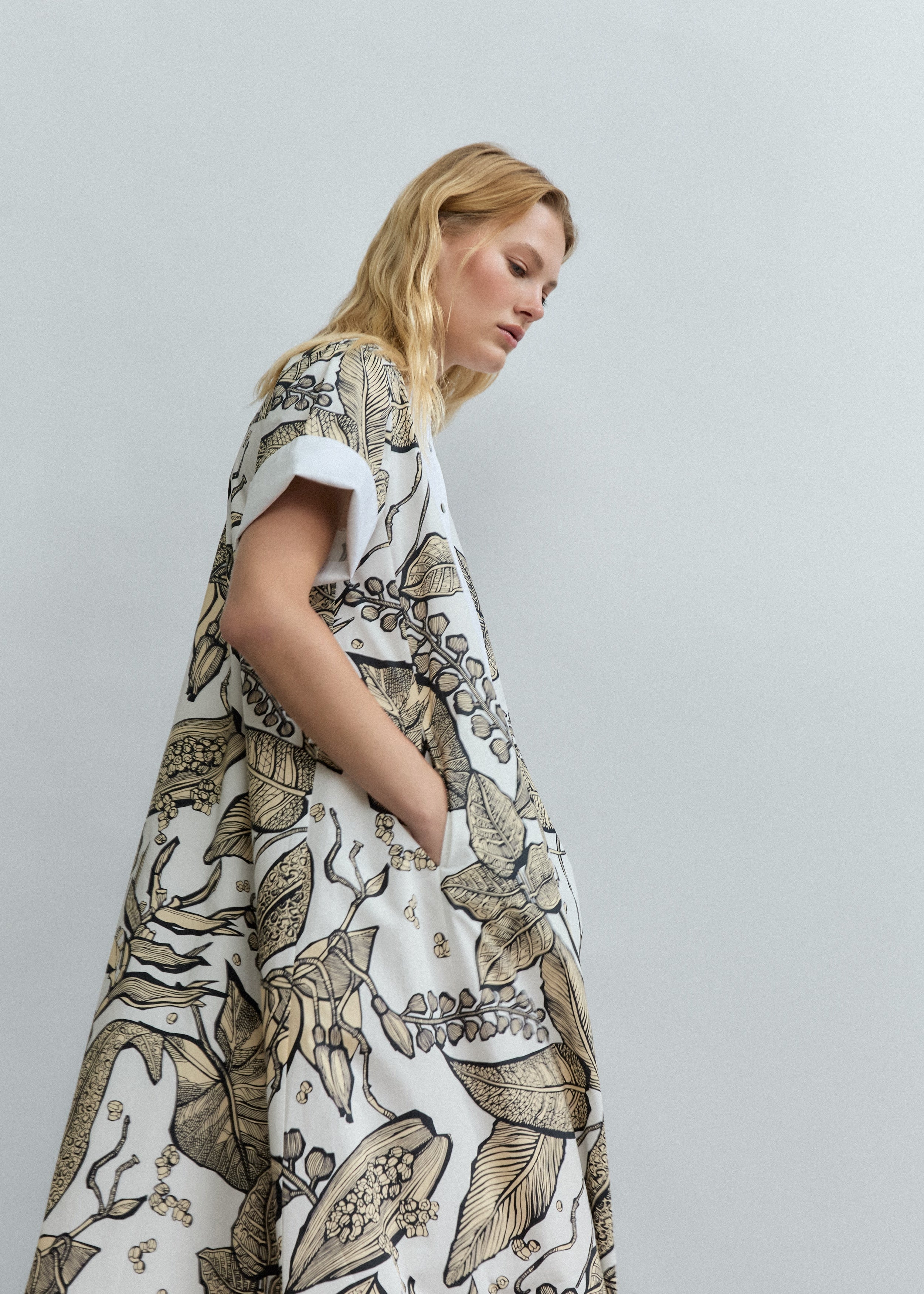 El corte largo y fluido genera caída natural y movimiento, creando un efecto elegante y sofisticado. La cintura ligeramente definida o caída libre (dependiendo del patrón) realza la silueta sin rigidez, mientras que el estampado Retro Bloomleaf, con flores y hojas estilizadas, aporta un detalle gráfico delicado y artístico que da personalidad a la prenda.