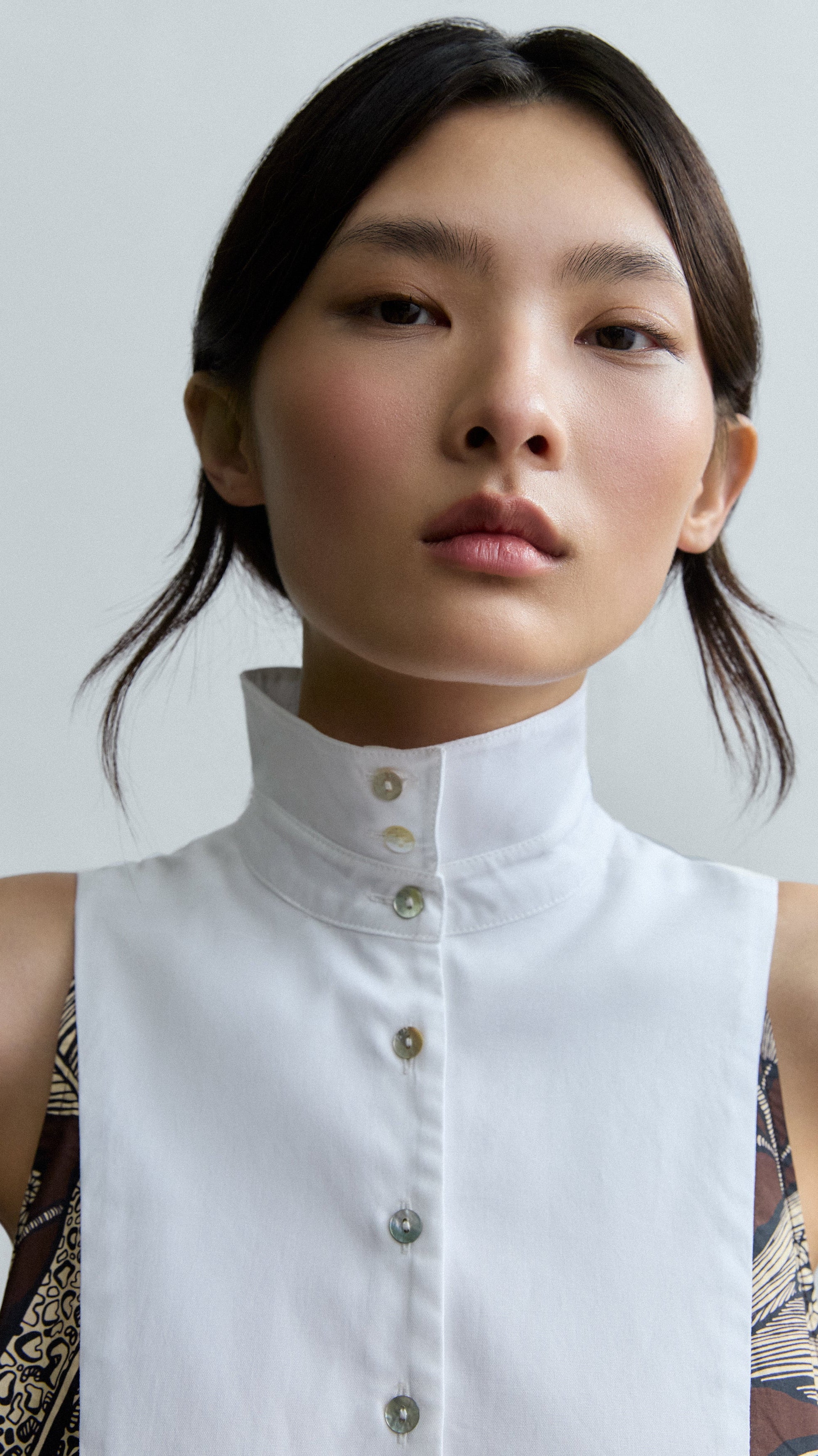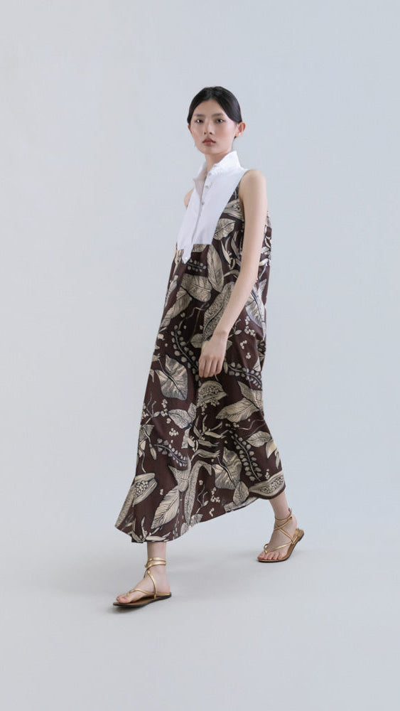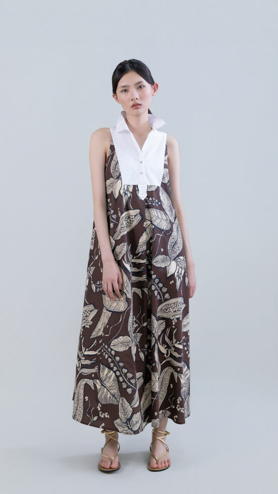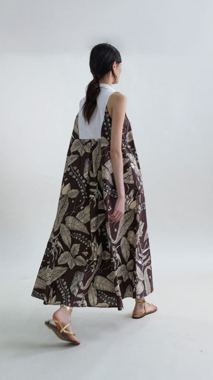 Este vestido largo sin mangas en Retro Bloomleaf combina un estampado delicado con una silueta elegante y contemporánea. El cuello mao doble aporta estructura y presencia, mientras que la parte delantera con yoke en contraste introduce un detalle gráfico que rompe la continuidad del estampado, aportando interés visual y sofisticación.
