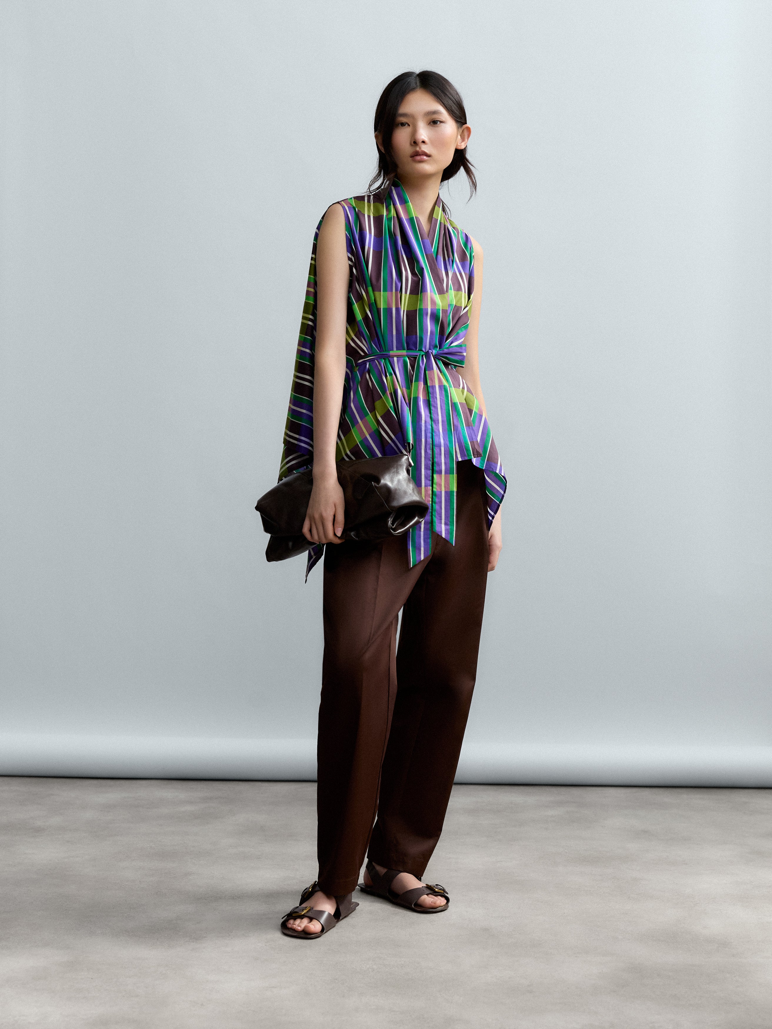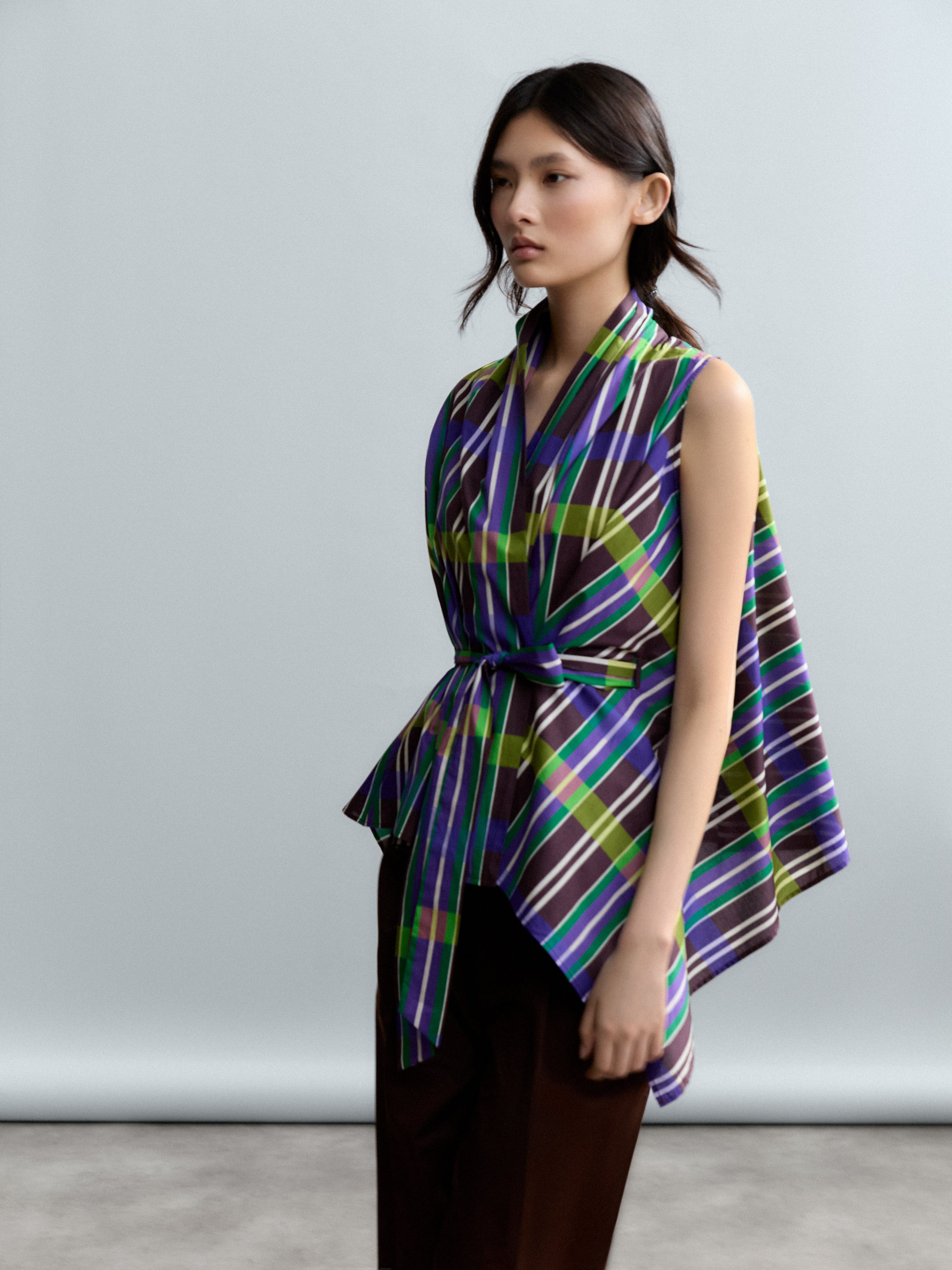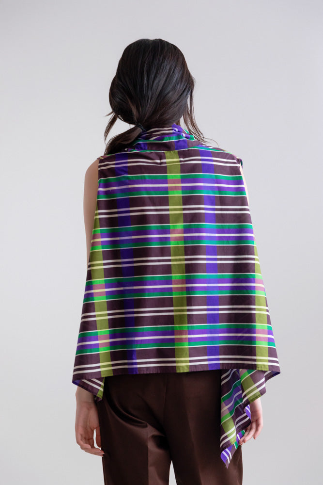 El estampado geométrico Retro Prism, con líneas verticales y horizontales en tonos morado, verde, marrón y amarillo, aporta dinamismo visual y carácter gráfico sin perder refinamiento.