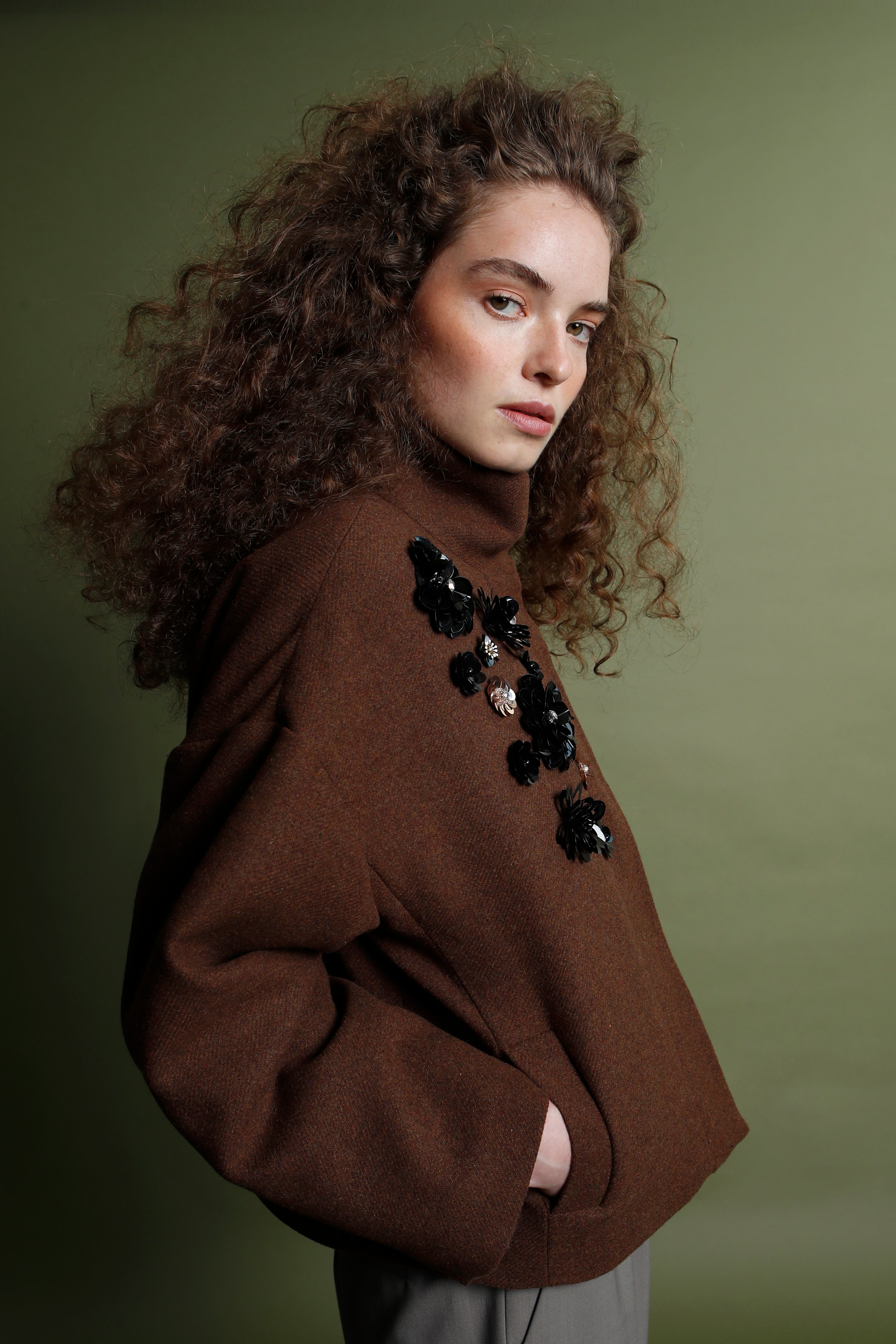 En el lateral del cuello, un conjunto de flores metálicas aplicadas a mano aporta textura, brillo sutil y un enfoque artístico que transforma esta chaqueta en una pieza verdaderamente especial. El contraste entre el acabado técnico del tejido y los relieves florales crea un juego visual potente, refinado y moderno.