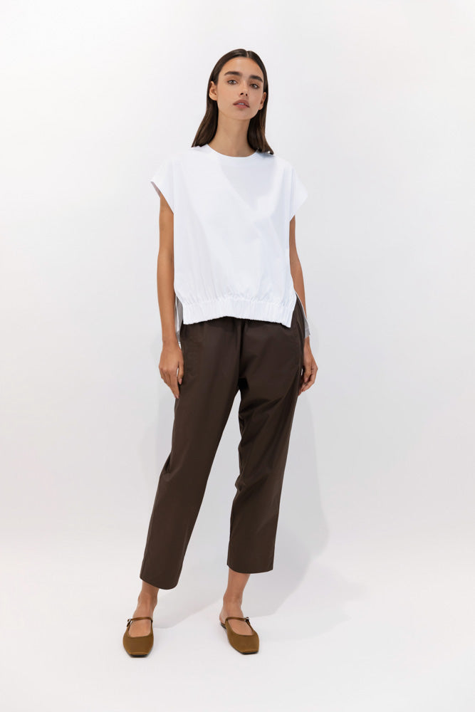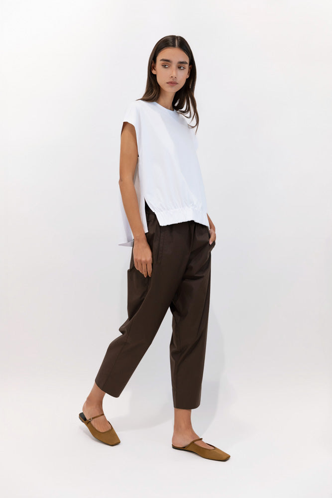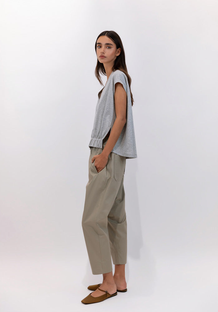 El bajo ligeramente recogido y vuelto introduce un gesto casual que equilibra la estructura estrecha del diseño, aportando un cierre visual suave y moderno. Un jogger versátil, pensado para acompañar el movimiento con comodidad, pero con una intención estética más afinada y urbana..