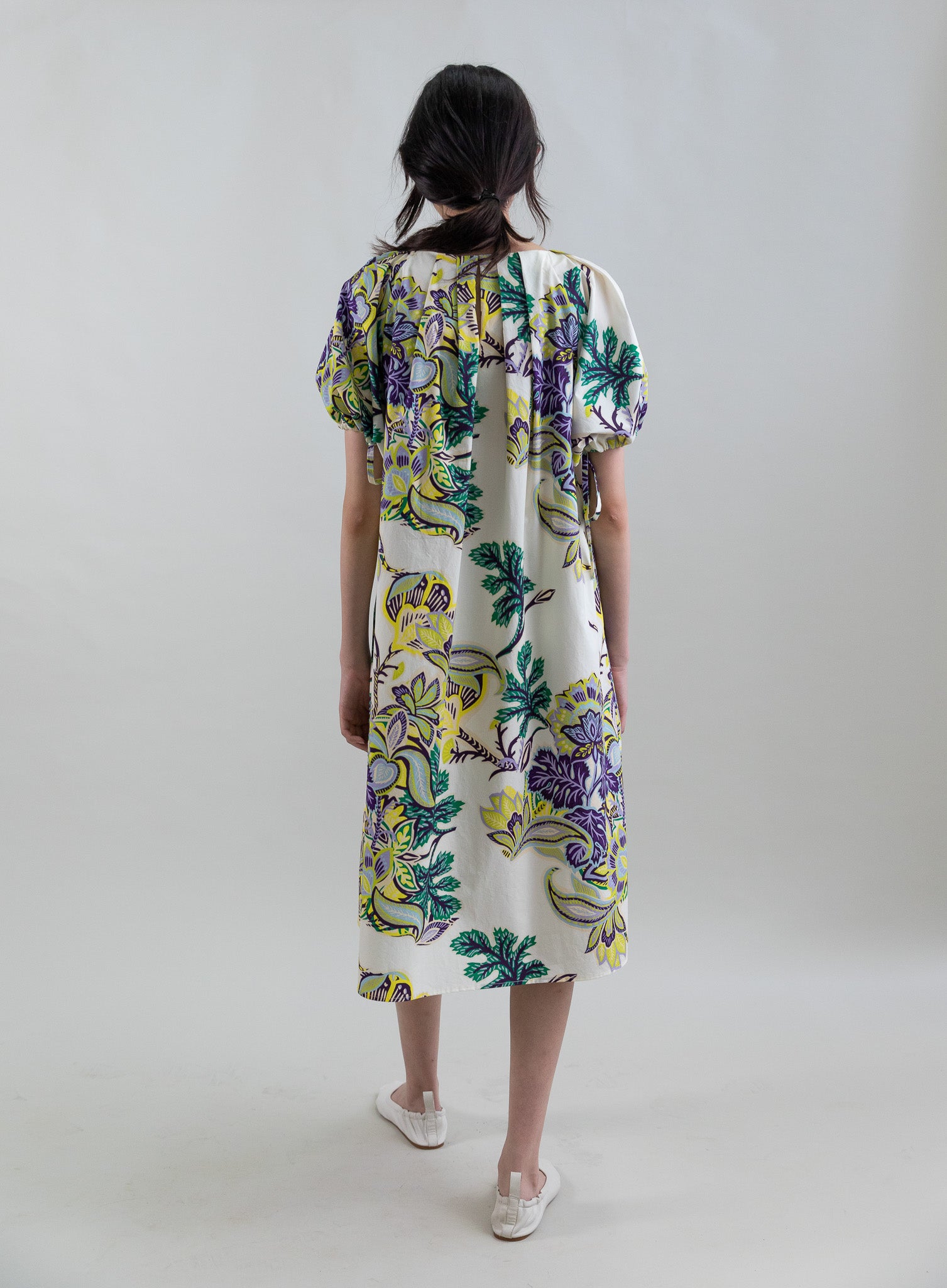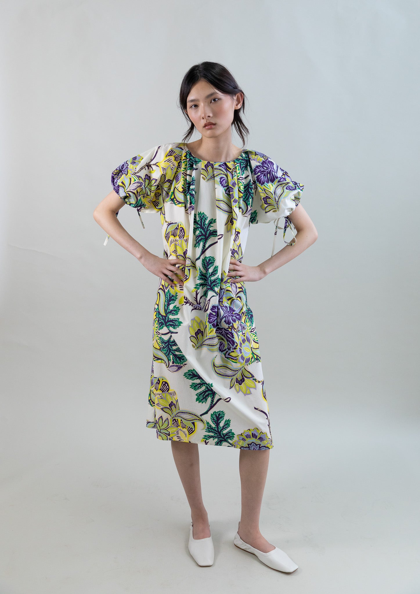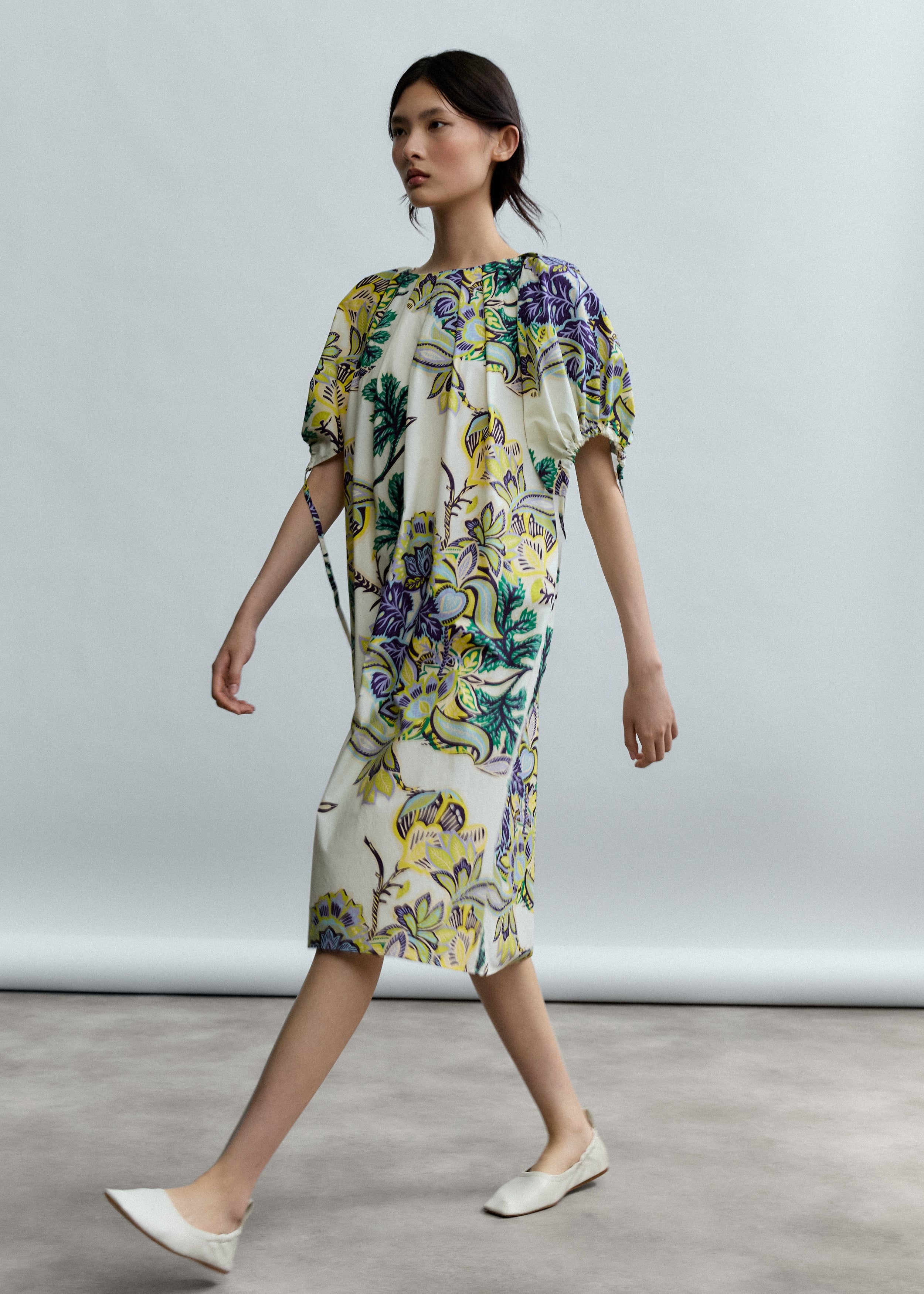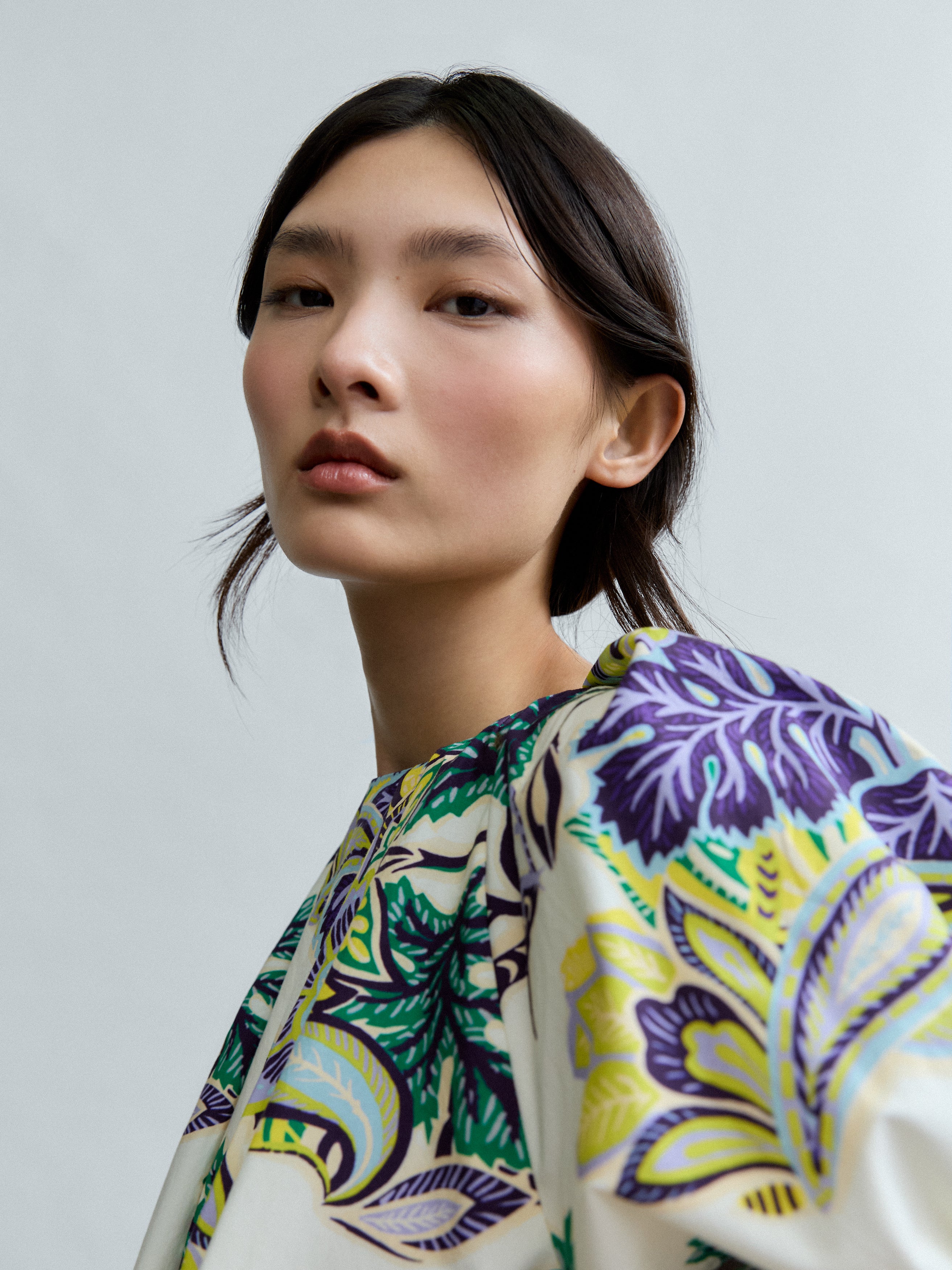 La silueta recta y fluida favorece la comodidad y la libertad de movimiento, mientras que el estampado floral de gran escala, inspirado en la estética setentera, combina tonos marigold, verde y violeta sobre una base luminosa, aportando un carácter gráfico sofisticado y fresco.